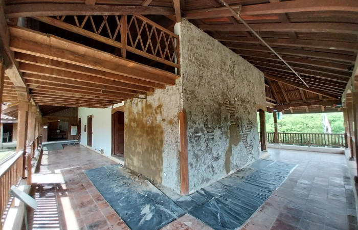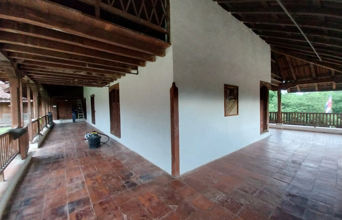 Debido al desprendimiento del encalado y el repello en las paredes de bahareque que conforman la Casona de Santa Rosa, así como al deterioro acumulado por el uso de materiales como revestimientos comerciales en trabajos anteriores, desde el 17 de julio de 2024 se llevaron a cabo trabajos de intervención. Estos buscaban retirar los repellos sueltos de las áreas dañadas y revocar nuevamente las paredes con barro, utilizando dos capas de tierra preparadas con antelación para posteriormente encalar con cal apagada añejada.