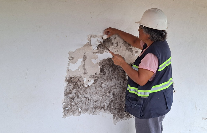 Inicio de trabajos. Desprendimientos de repellos dañados. 17 de julio 2024. Fotografía Felipe Pizarro