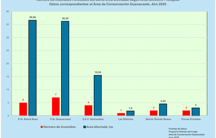 Entre las áreas protegidas más impactadas se encuentran el Parque Nacional Santa Rosa (36.66 ha) y el Parque Nacional Guanacaste (36.25 ha), además de afectaciones en la Estación Experimental Forestal Horizontes y en el Sector Las Delicias.