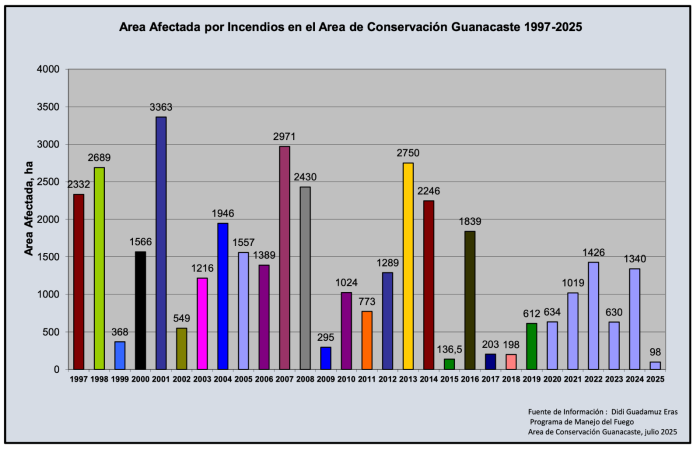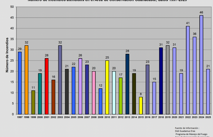 El Área de Conservación Guanacaste (ACG), mediante su Programa de Manejo del Fuego (PMF), concluyó la temporada de incendios forestales 2025 con un total de 21 eventos atendidos, que afectaron 97.81 hectáreas de ecosistemas. De estos incidentes, 19 ocurrieron dentro de Áreas Silvestres Protegidas (ASP) con una afectación de 89.66 hectáreas, mientras que 2 eventos se registraron fuera de las ASP, sumando 8.15 hectáreas impactadas .