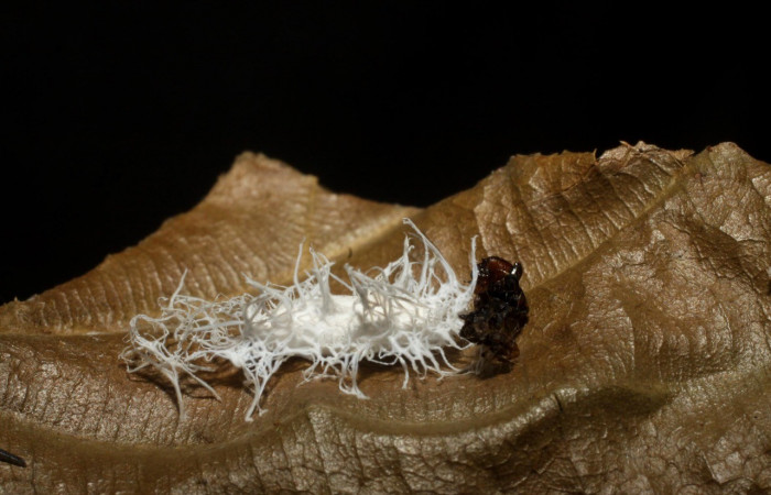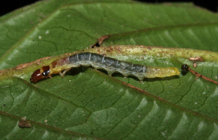 Figura 2.  Larva <i>Antaeotricha</i> Janzen07 (Depressariidae), tercer estadio, posición lateral, Sector San Cristóbal, Sendero Albergue Crater. Voucher