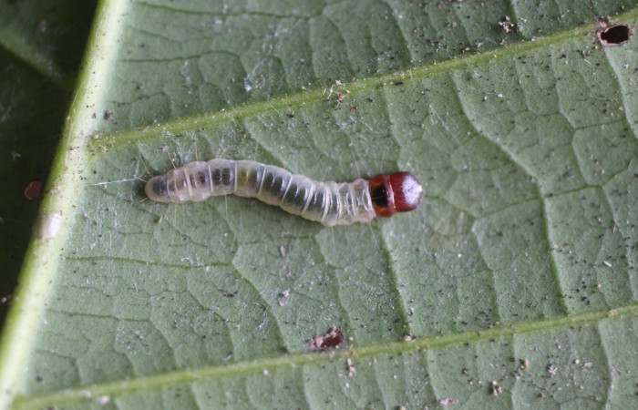 Figura 8. Larva <i>Antaeotricha</i> Janzen07 (Depressariidae), tercer estadio, posición dorsal, Sector San Cristóbal, Sendero Albergue Crater. Voucher 09-SRNP-4450-DHJ463989.jpg.