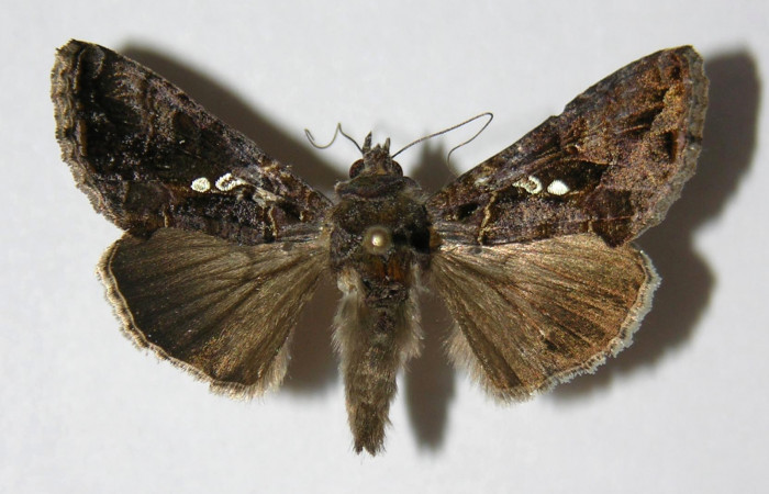 De mediano tamaño de coloración opaca con un par de puntos blancos plateados en las alas anteriores, alas posteriores cafe marrón (Fig. 13-14).