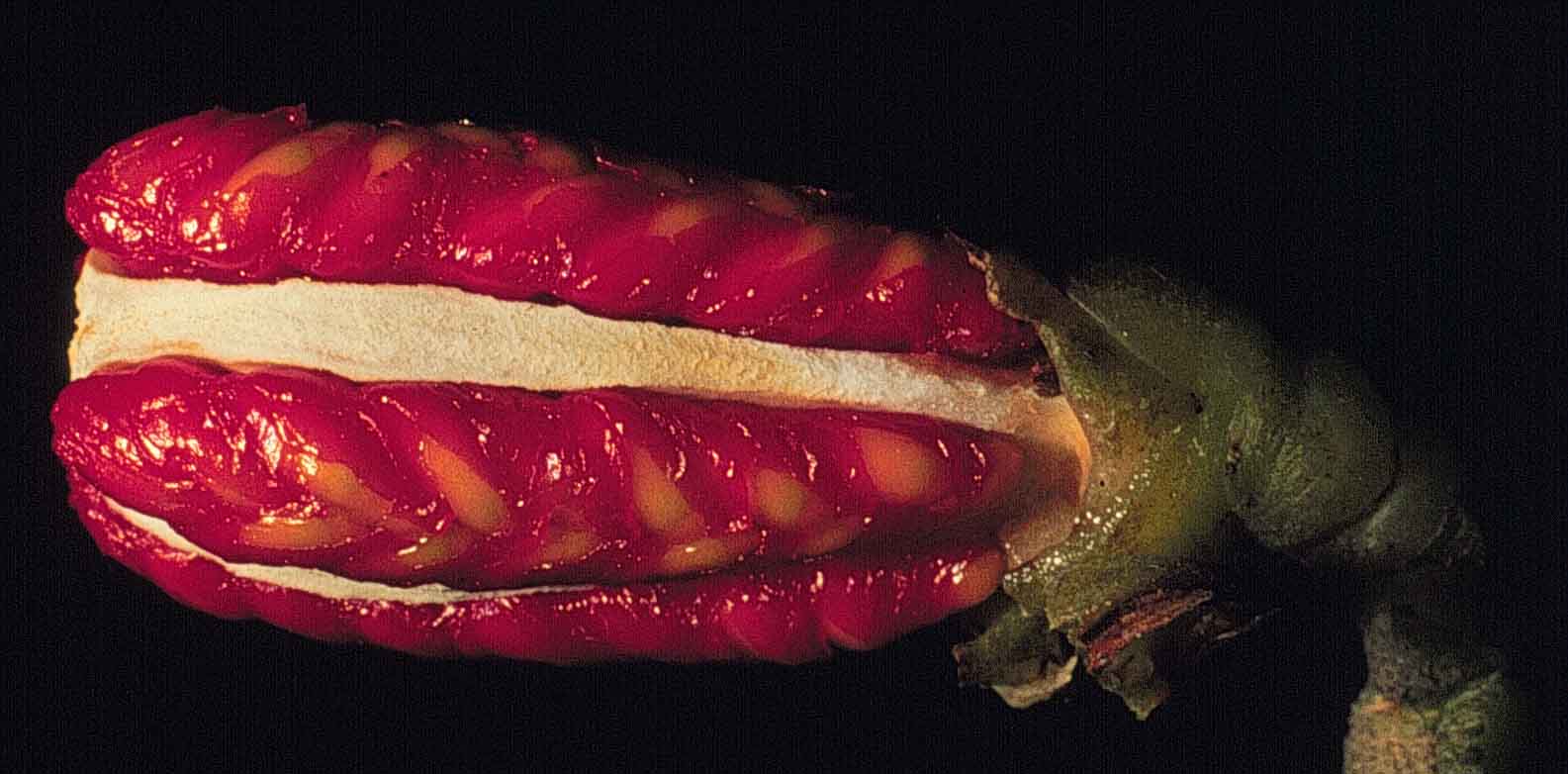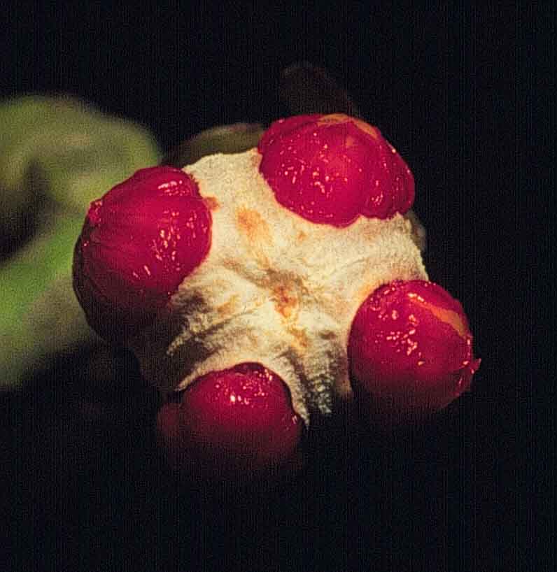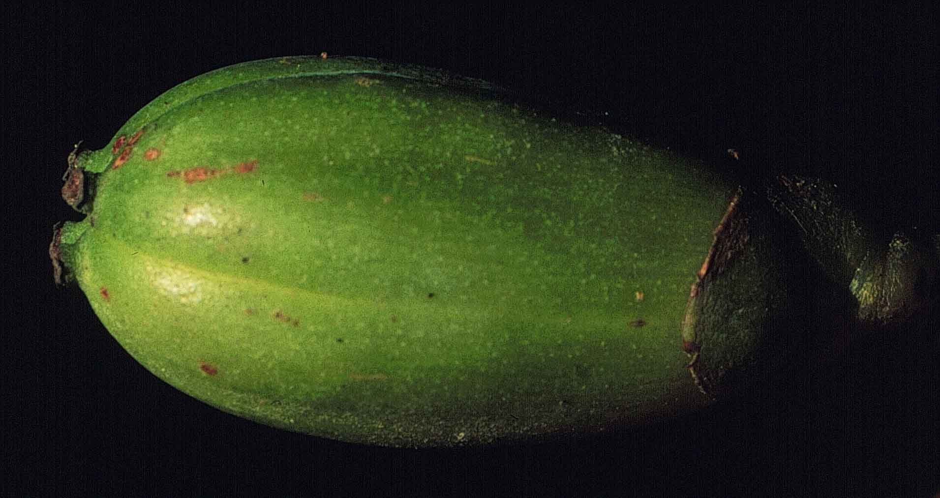 Inmaduro color verde, de forma elíptica, de 2.3 cm de lago, de un diámetro de 1 cm aproximadamente. Semillas de 20-25 por fruto, de 3 mm de largo, estan cubiertas por un arilo de color rojo.