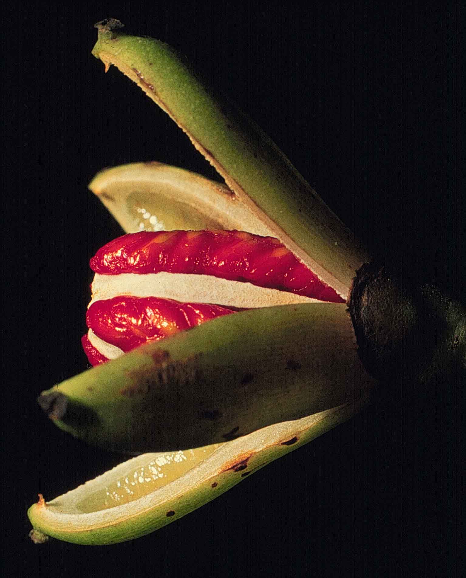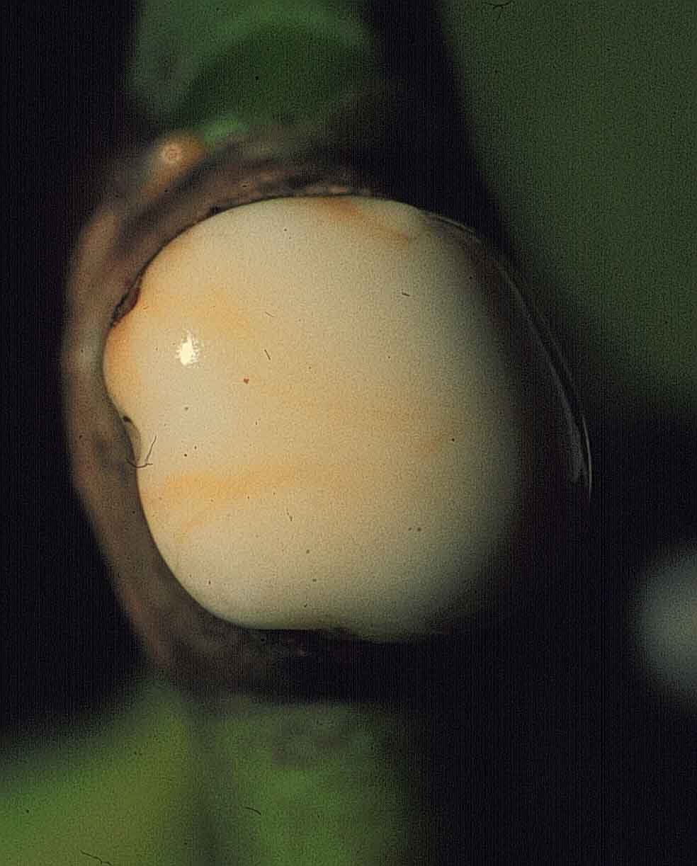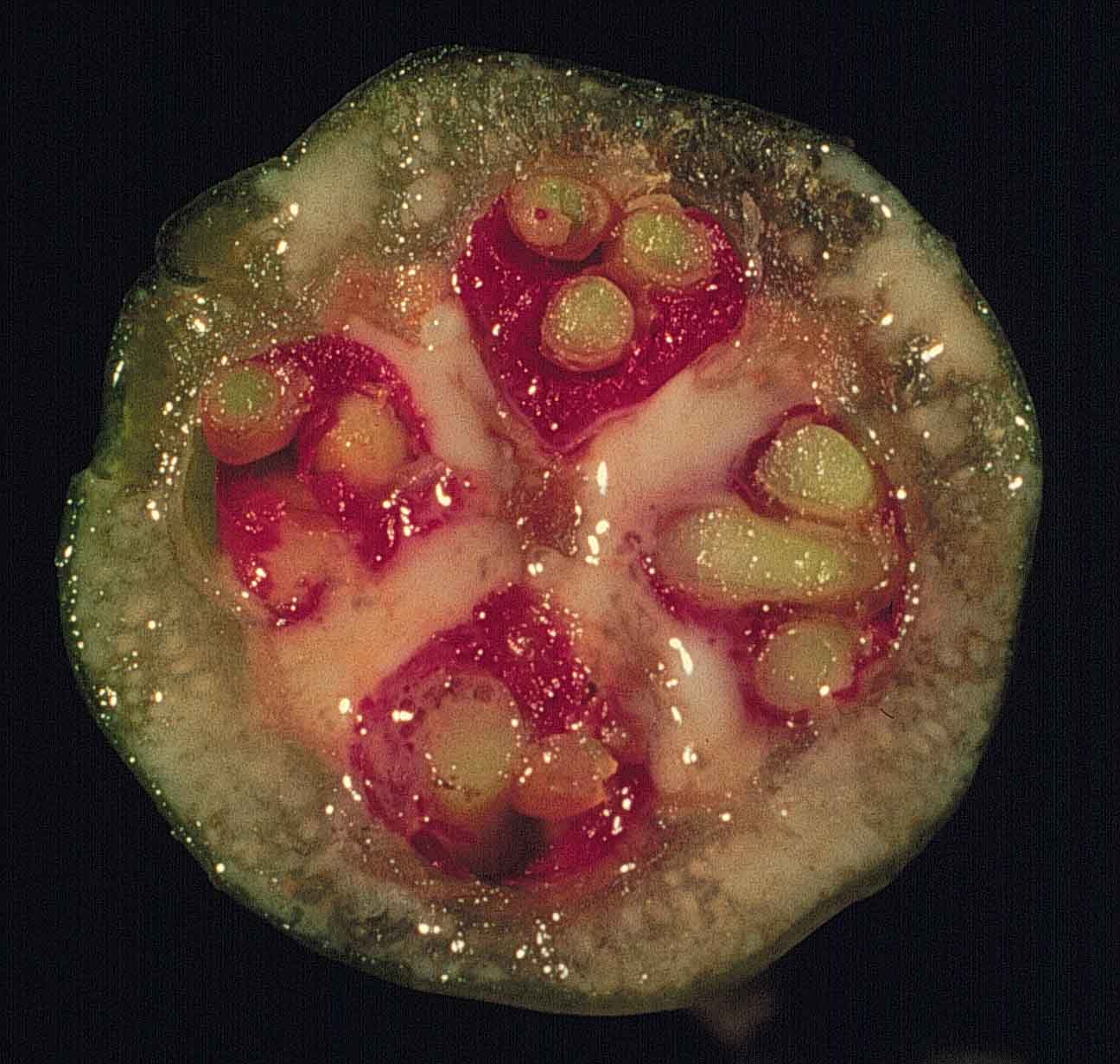 Inmaduro color verde, de forma elíptica, de 2.3 cm de lago, de un diámetro de 1 cm aproximadamente. Semillas de 20-25 por fruto, de 3 mm de largo, estan cubiertas por un arilo de color rojo.