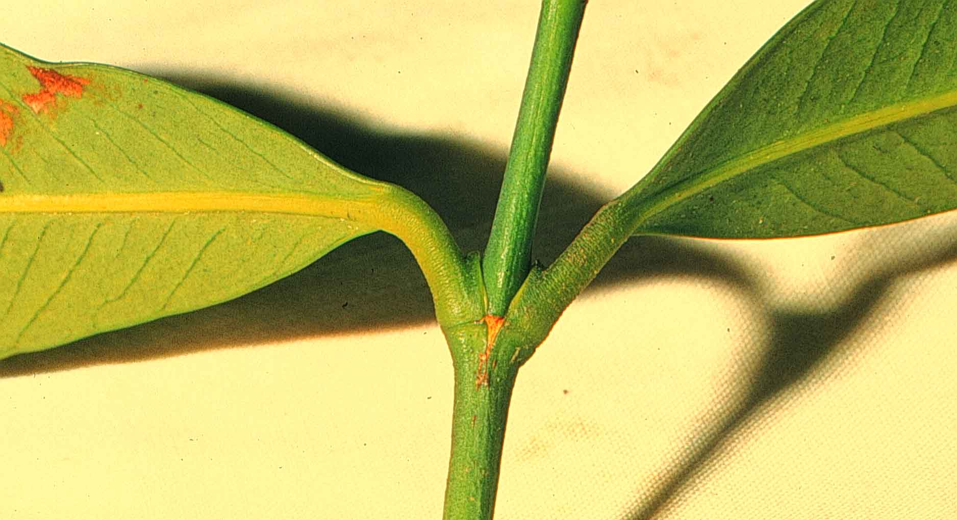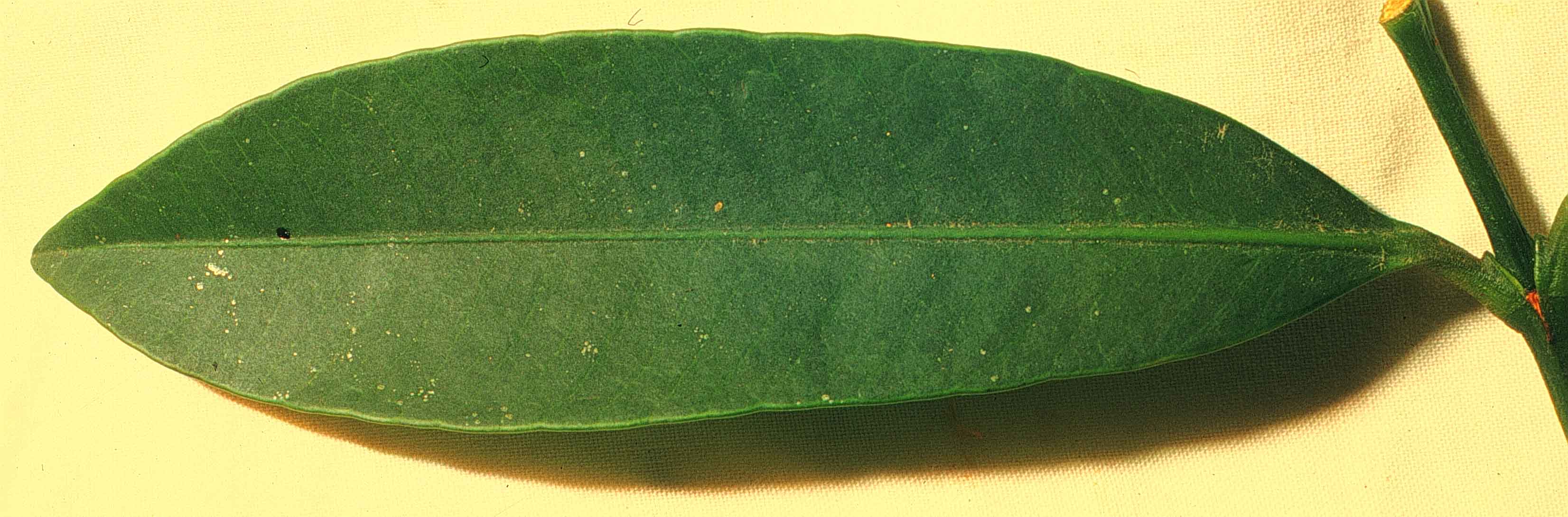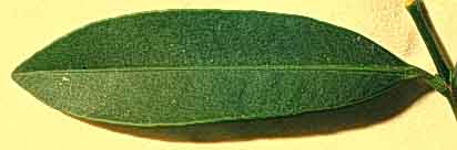 Simples y opuestas de margen entero. Forma lanceolada. Aproximadamente 5-10 cm de largo. Verde oscuro por el haz y verde claro por el envés. El peciolo es aplastado por el haz y mide de 0.8-1 cm.