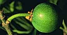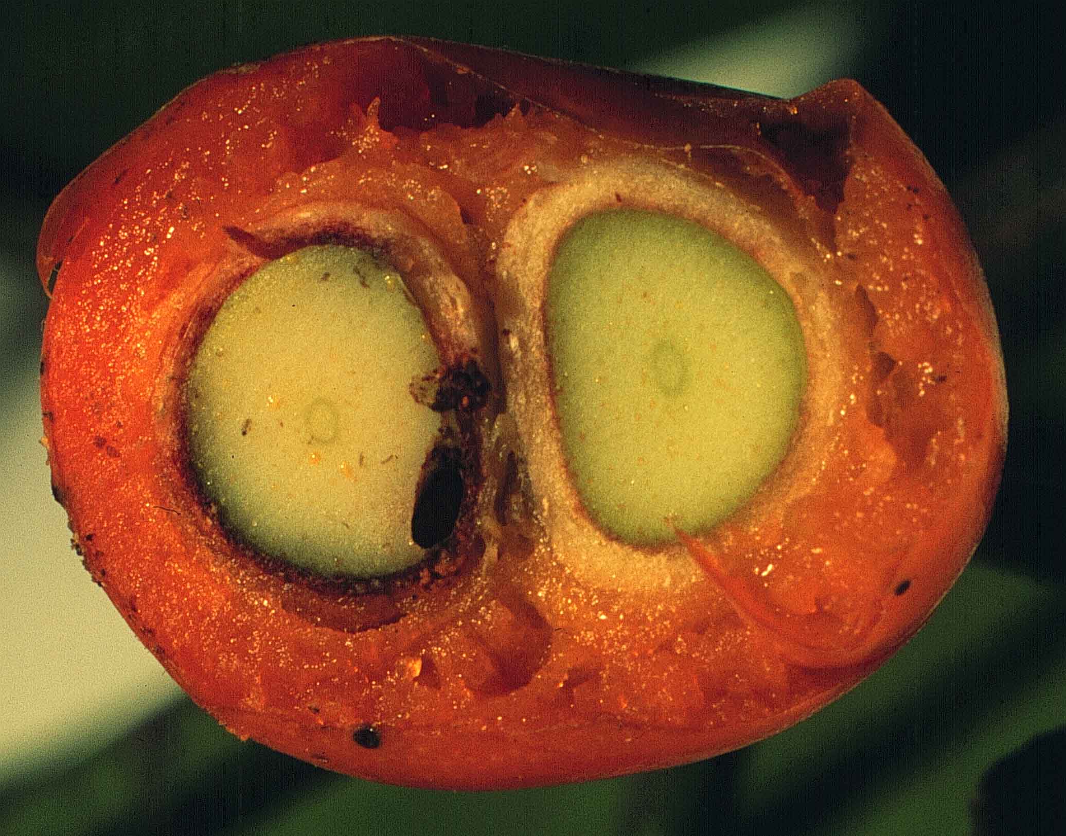 Fruto inmaduro color verde. Maduro de color anaranjado con un diámetro aproximado de 1.5 cm y 1.8 cm de largo. Tienen sabor agridulce.
