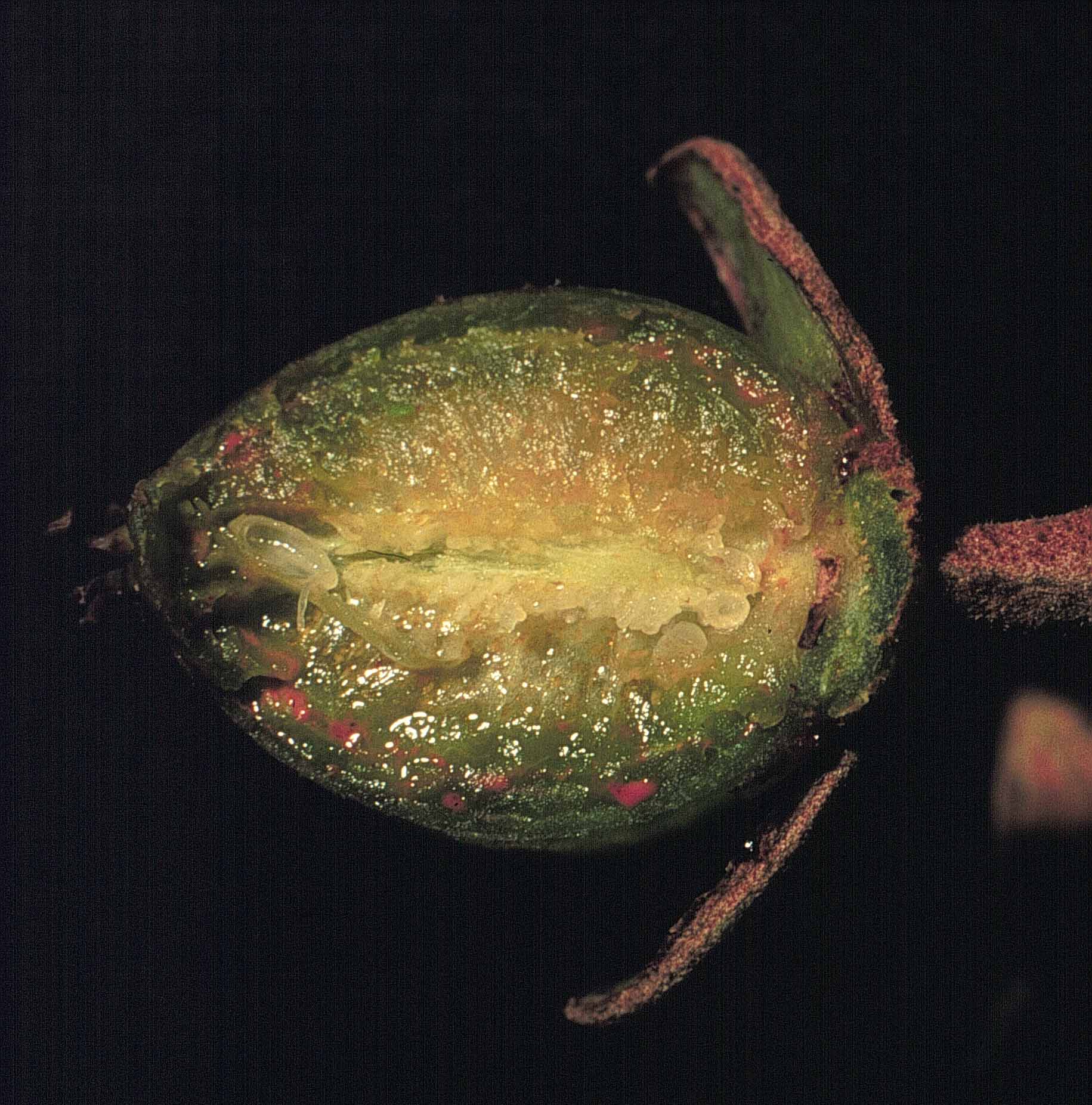 Bayas ovoides, de 0.8-1.5 cm de largo. Secreta látex anaranjado si se le hace un corte.