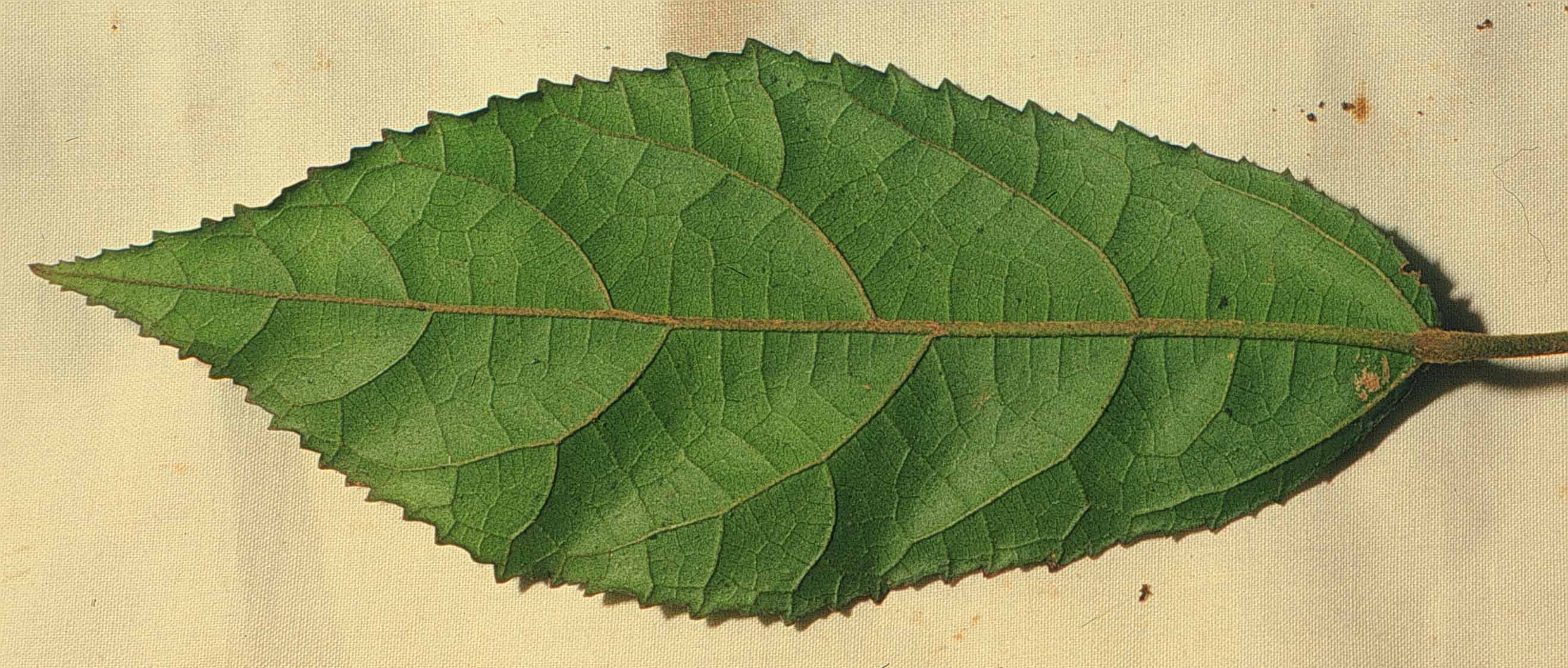 Simples alternas, de forma lanceoladas, 8-16 cm de largo, con peciolo cilíndrico de 1-2.5 cm de largo.