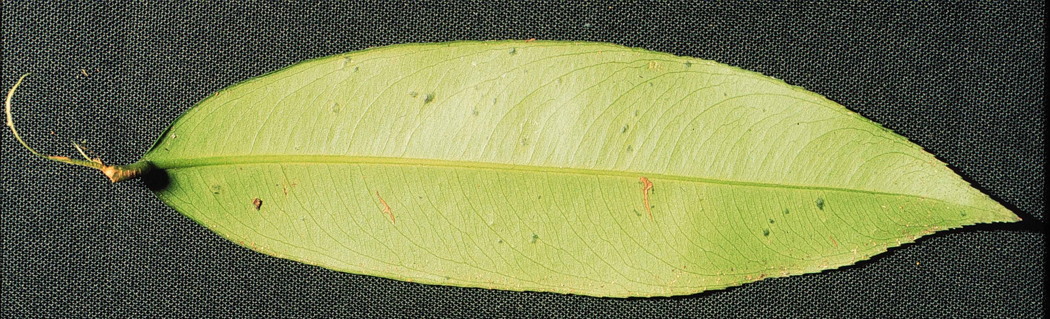 Hojas simples y alternas, de forma lanceolada a oblanceolada y totalmente glabras por ambos lados. Miden de 6-16 cm de largo. Verde oscuro por el haz y verde claro por el envés. Margen aserrado. Peciolo corto (0.5 cm delargo).
