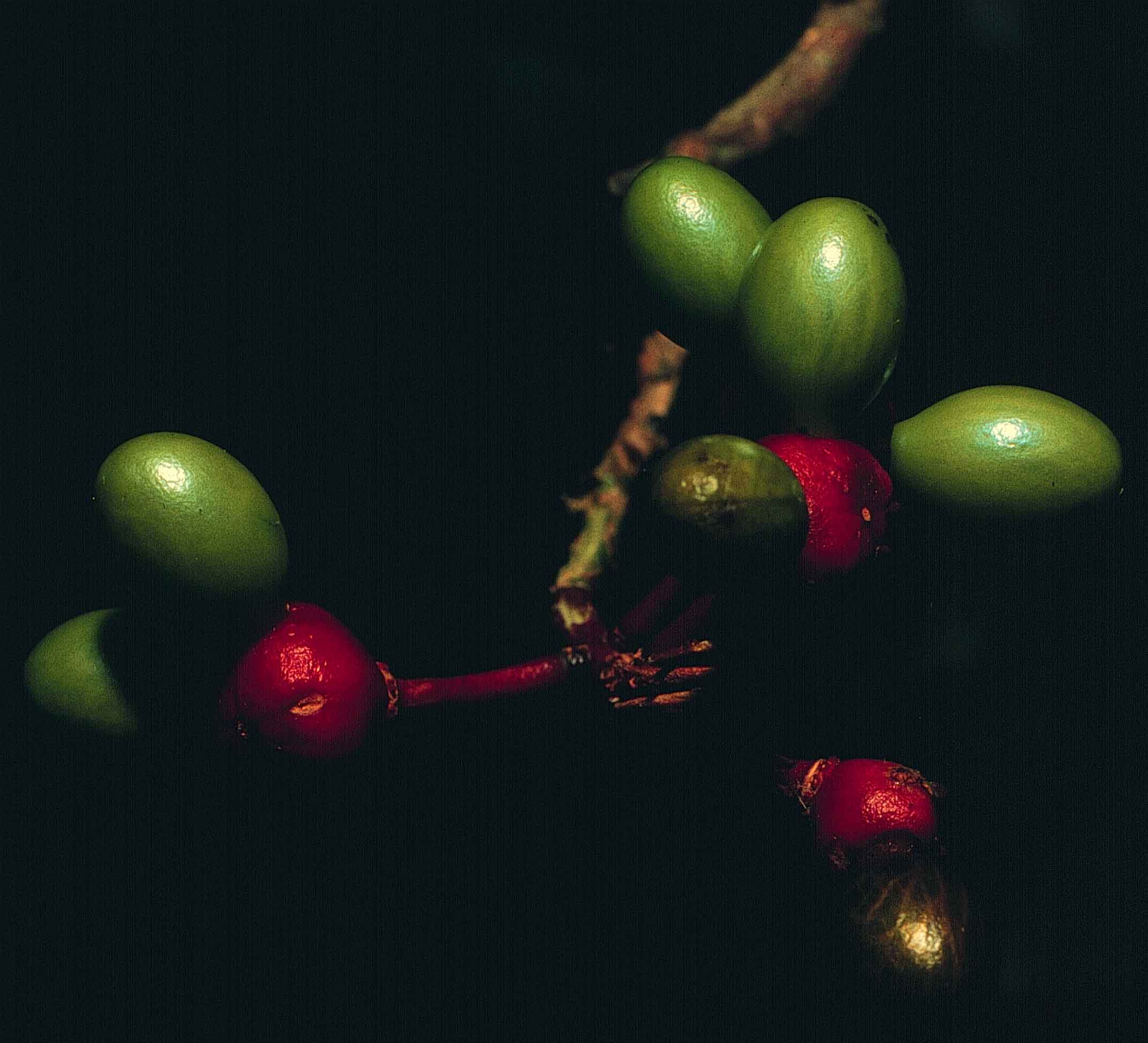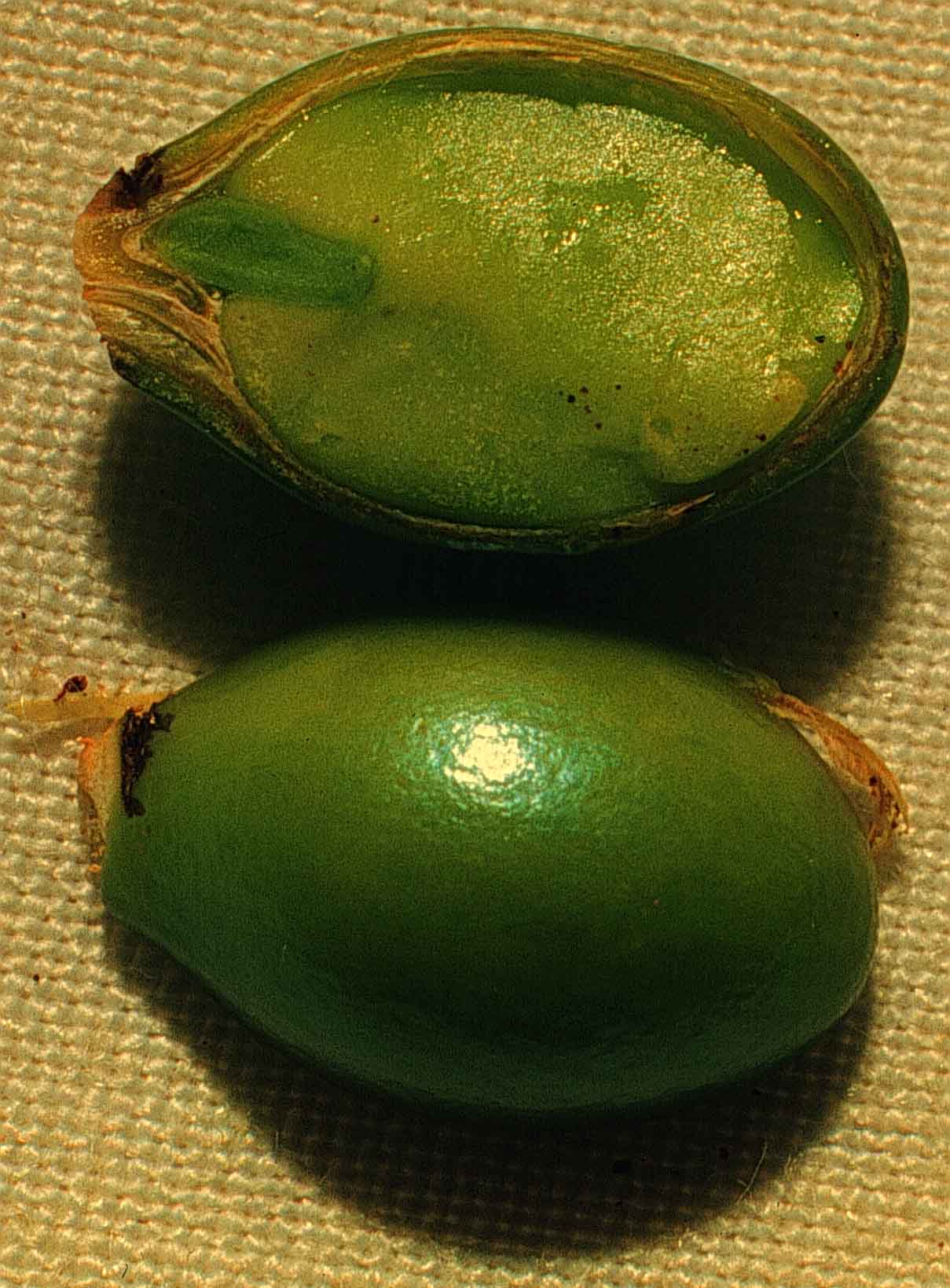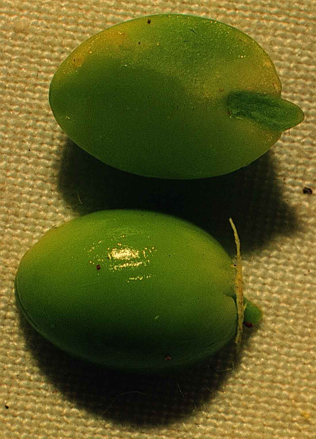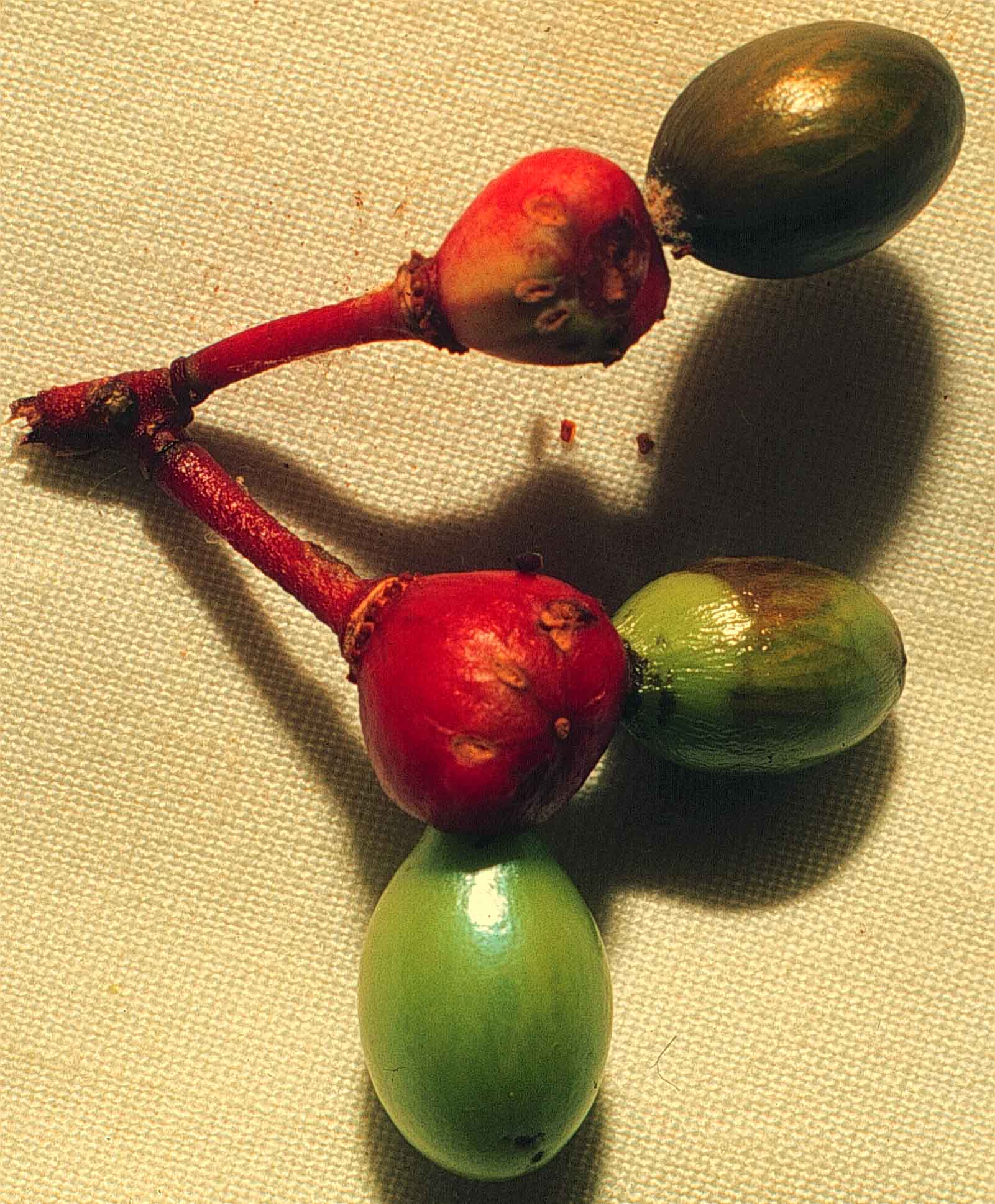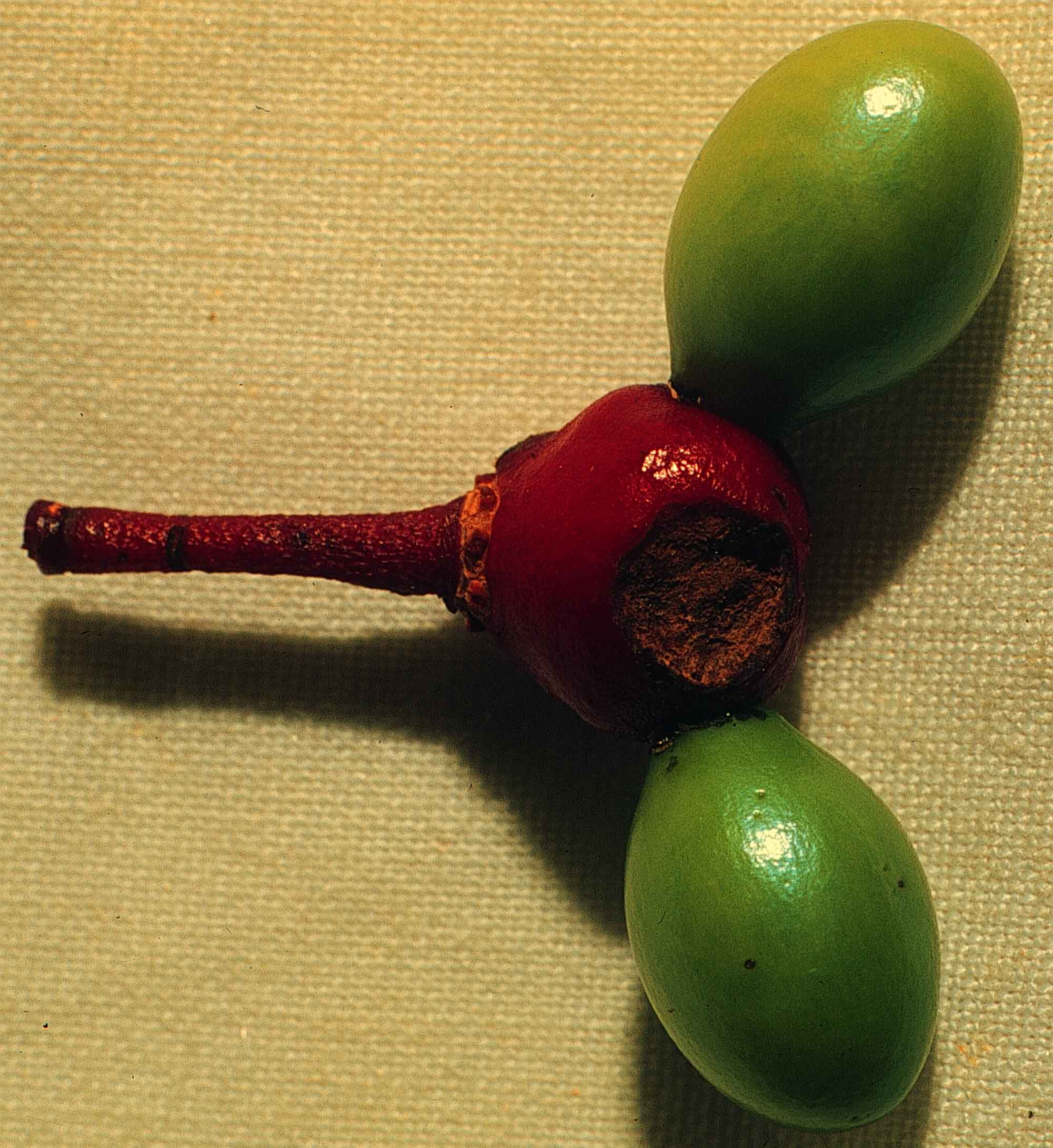El fruto es muy peculiar ya que el receptáculo (la base del fruto) es engrosado y rojo y cada segmento individual del ovario esta separado en en la superficie del receptáculo en tres bayas negras (Gentry 1984).