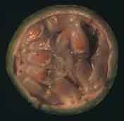 Son bayas ovoides, 5-8 cm de largo, verde-amarillentos con líneas blacas (Croat 1978). El fruto inmaduro es verde claro. Tienen un diámetreo aproximado de 3.5 cm y un largo de 6 cm. Maduran en febrero.