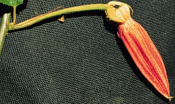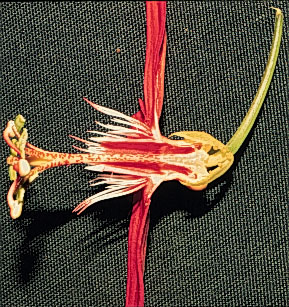 El caliz es blanco verdoso, la corola es roja. Son flores perfectas (ambos sexos presentes en la misma flor). Las inflorescencias están compuestas por una sola flor y son axilares. Abren por la mañana. La floración es en enero.