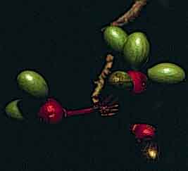 El fruto es muy peculiar ya que el receptáculo (la base del fruto) es engrosado y rojo y cada segmento individual del ovario esta separado en en la superficie del receptáculo en tres bayas negras (Gentry 1984).