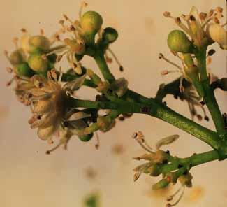 Las panículas son terminales. Las flores son perfectas y abren durante la mañana. Los botones son esféricos y verde claro.