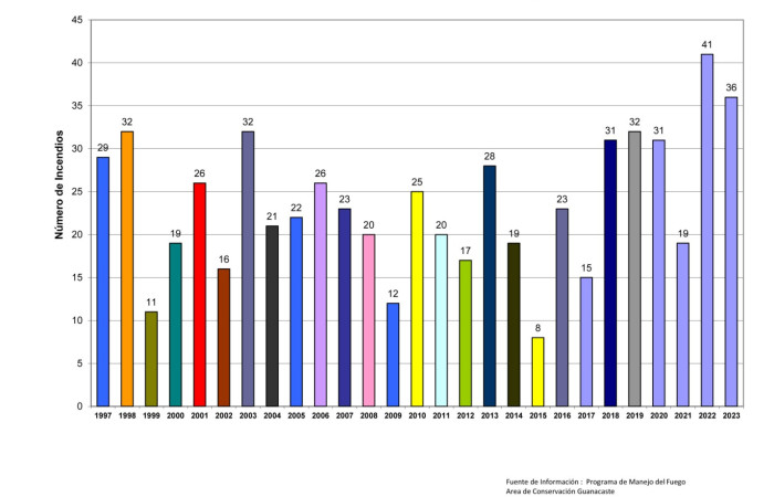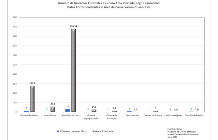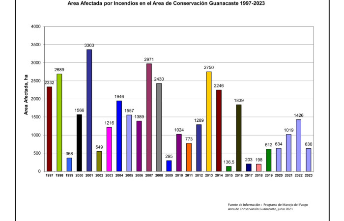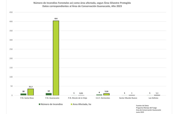 Dentro de Área Silvestre Protegida se afectaron 451 hectáreas en 28 incendios forestales, 178 ha en fincas privadas aledañas que representaban una amenaza para ACG con un total 8 incendios forestales, el incidente de mayor impacto se declaró el día 22 de marzo 2023 en el sitio Laguna Juanilama, Parque Nacional Guanacaste con 200 hectáreas afectadas, teniendo como un total de 36 incendios forestales atendidos los cuales afectaron 630 ha durante la temporada.