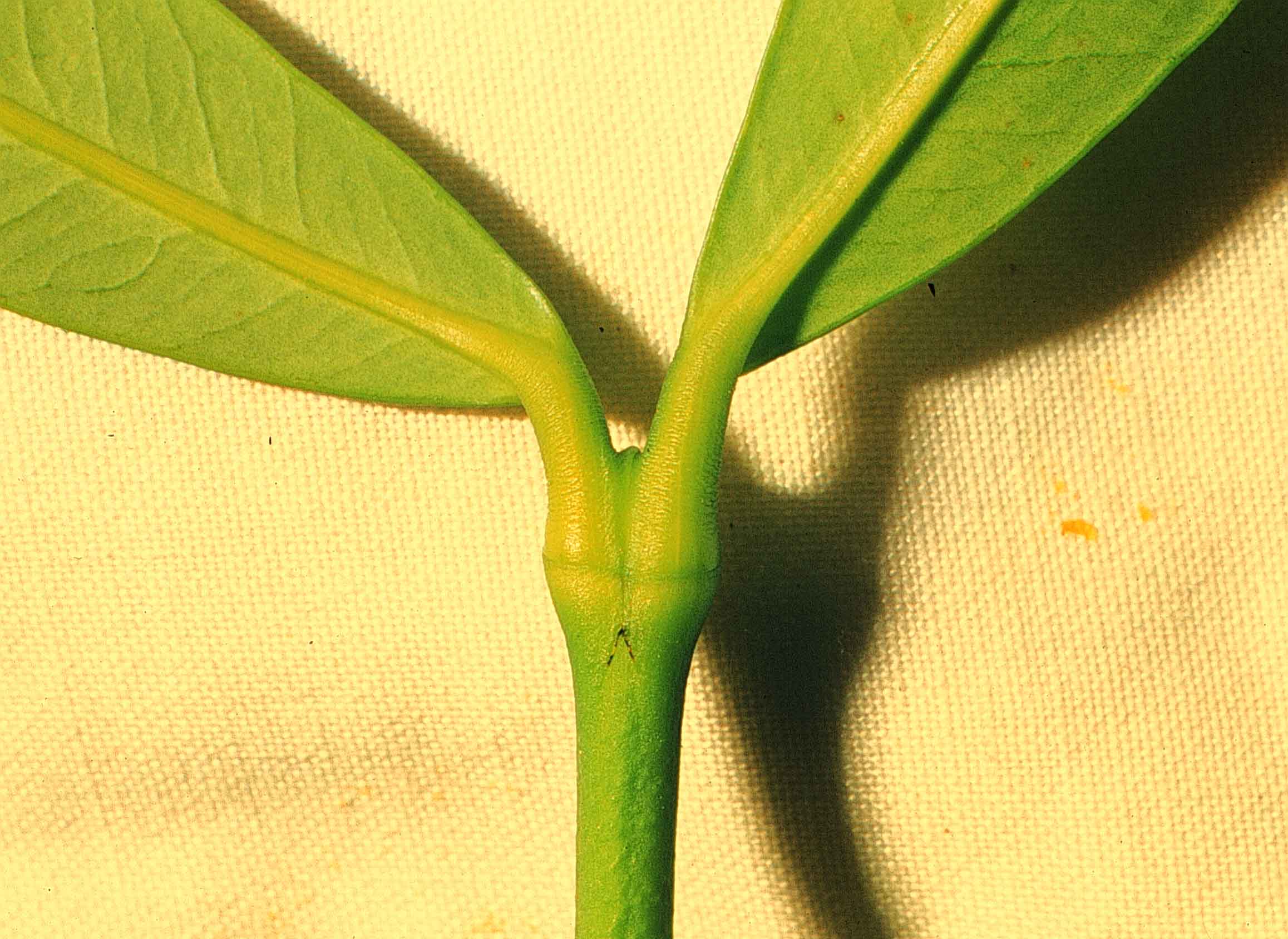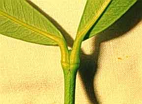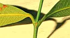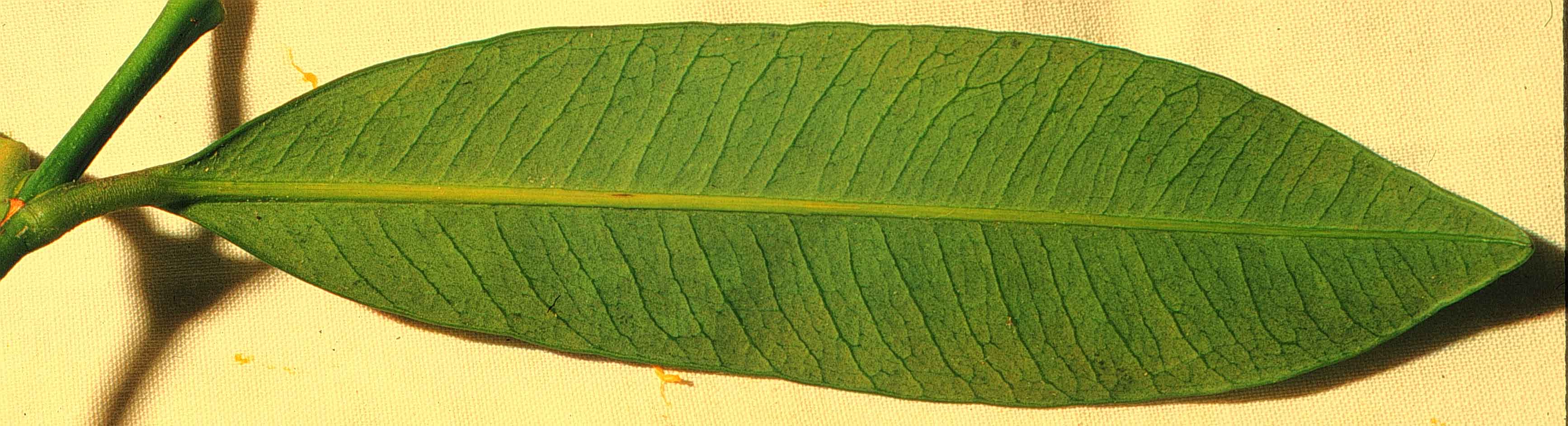 Simples y opuestas de margen entero. Forma lanceolada. Aproximadamente 5-10 cm de largo. Verde oscuro por el haz y verde claro por el envés. El peciolo es aplastado por el haz y mide de 0.8-1 cm.