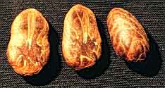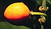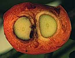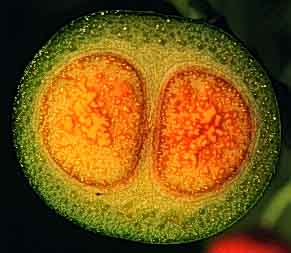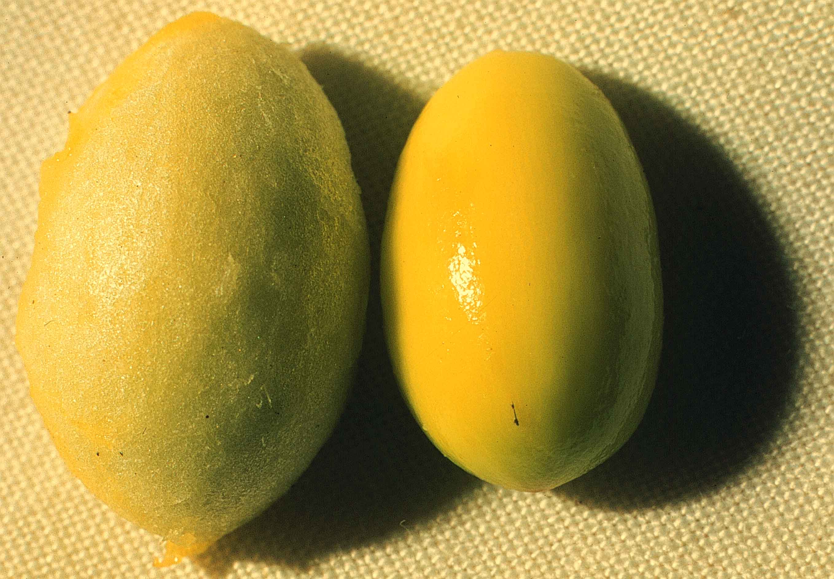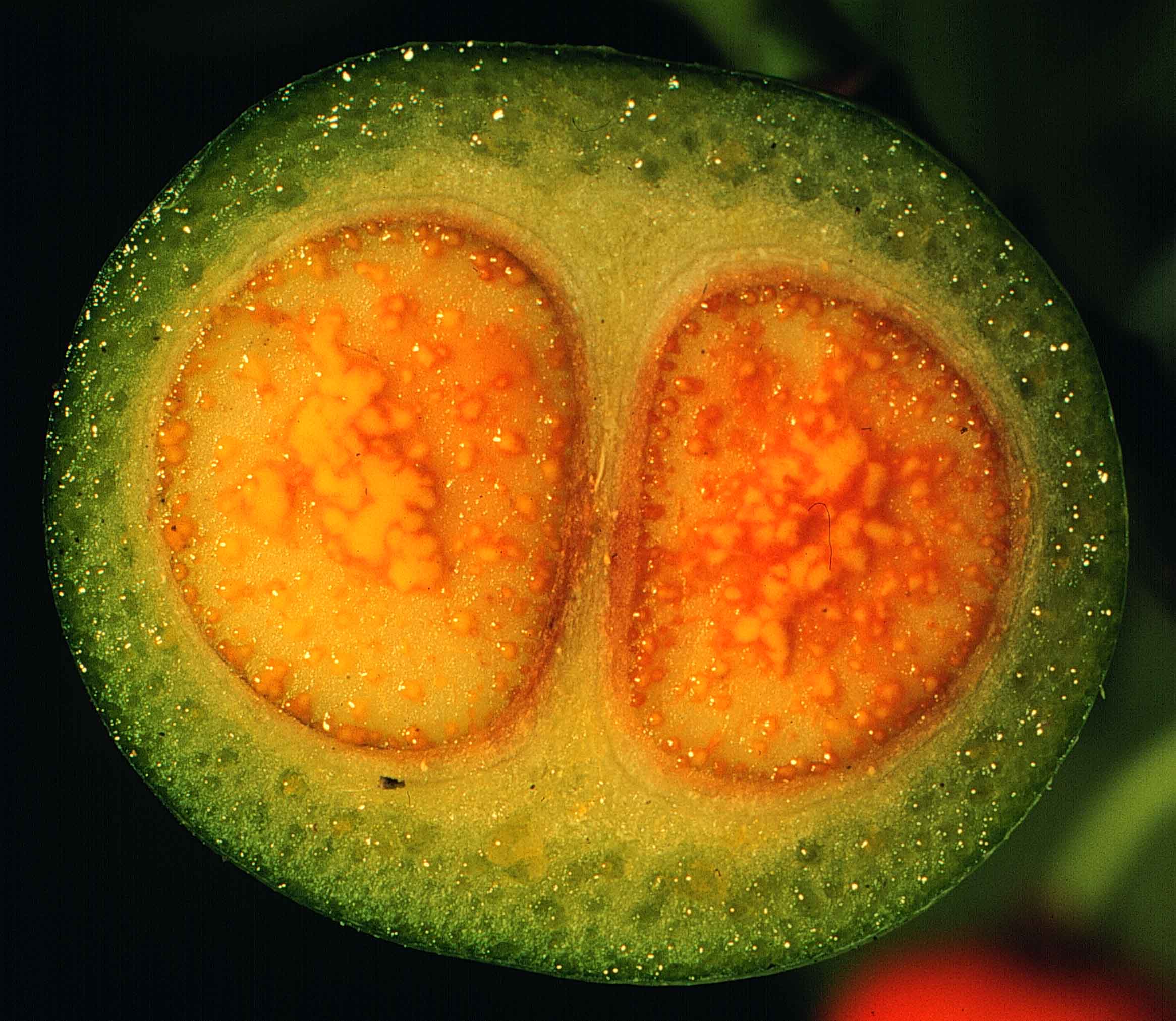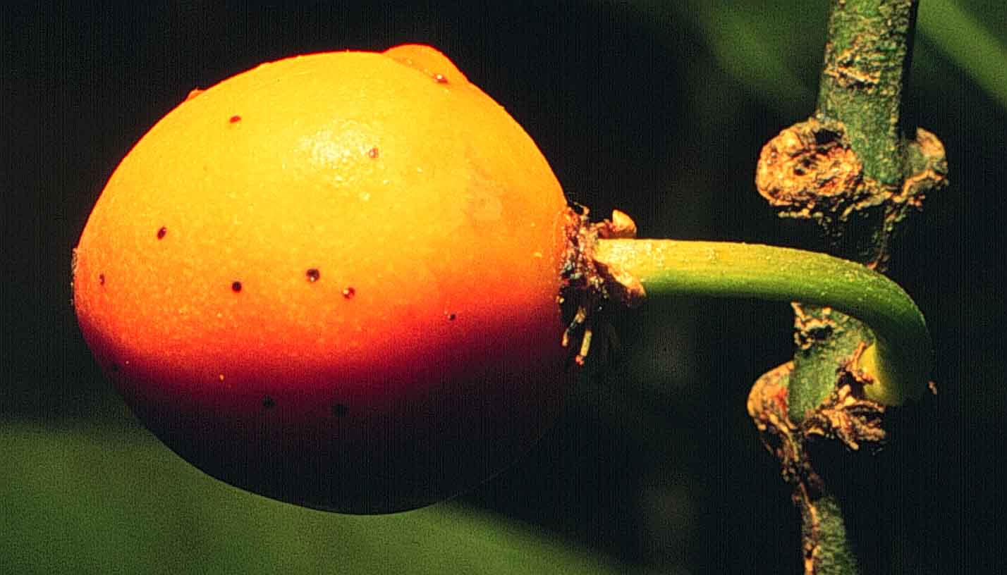 Fruto inmaduro color verde. Maduro de color anaranjado con un diámetro aproximado de 1.5 cm y 1.8 cm de largo. Tienen sabor agridulce.