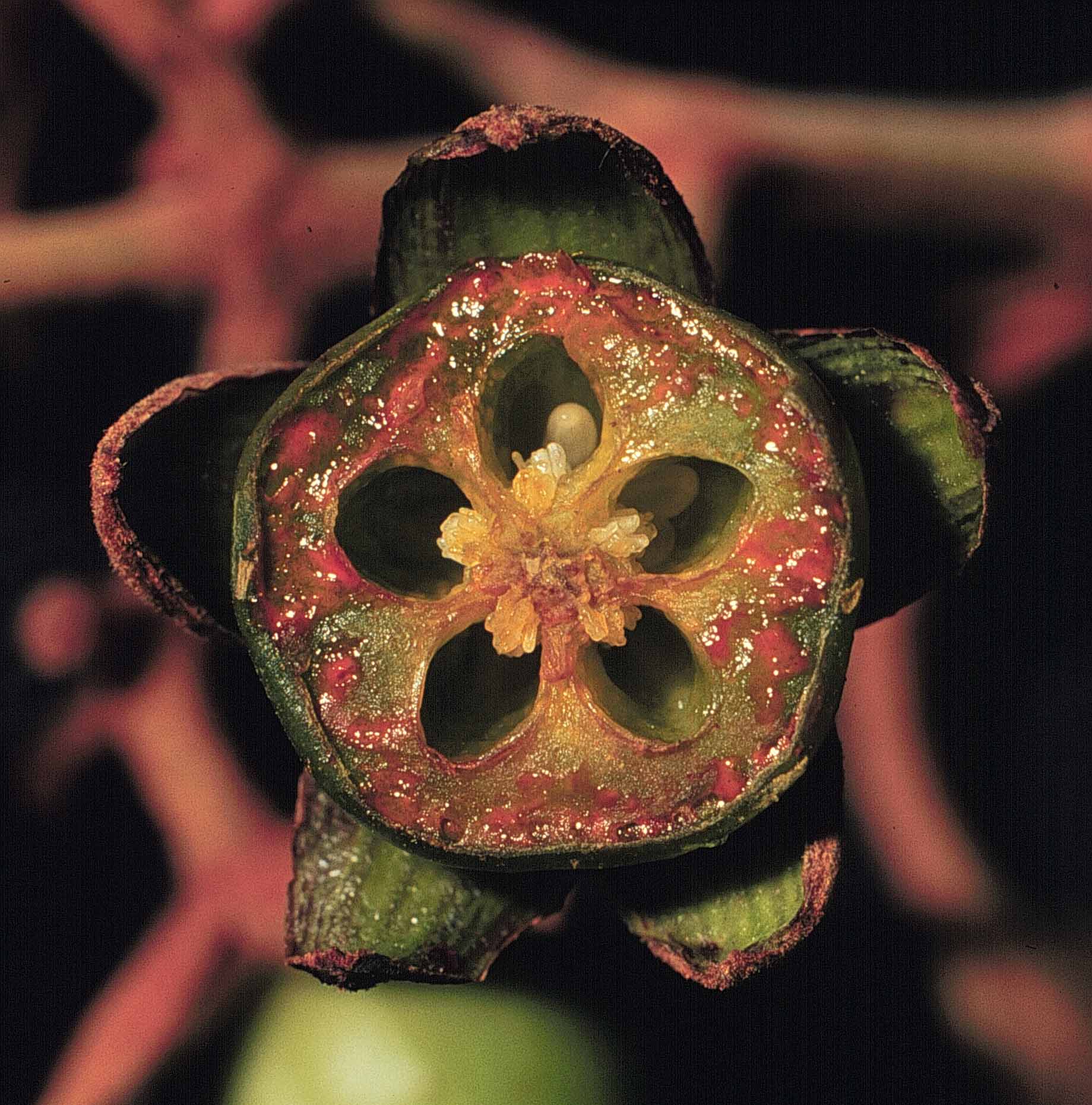 Bayas ovoides, de 0.8-1.5 cm de largo. Secreta látex anaranjado si se le hace un corte.