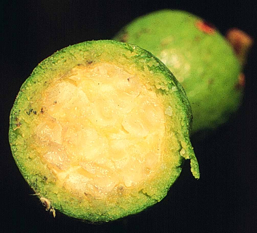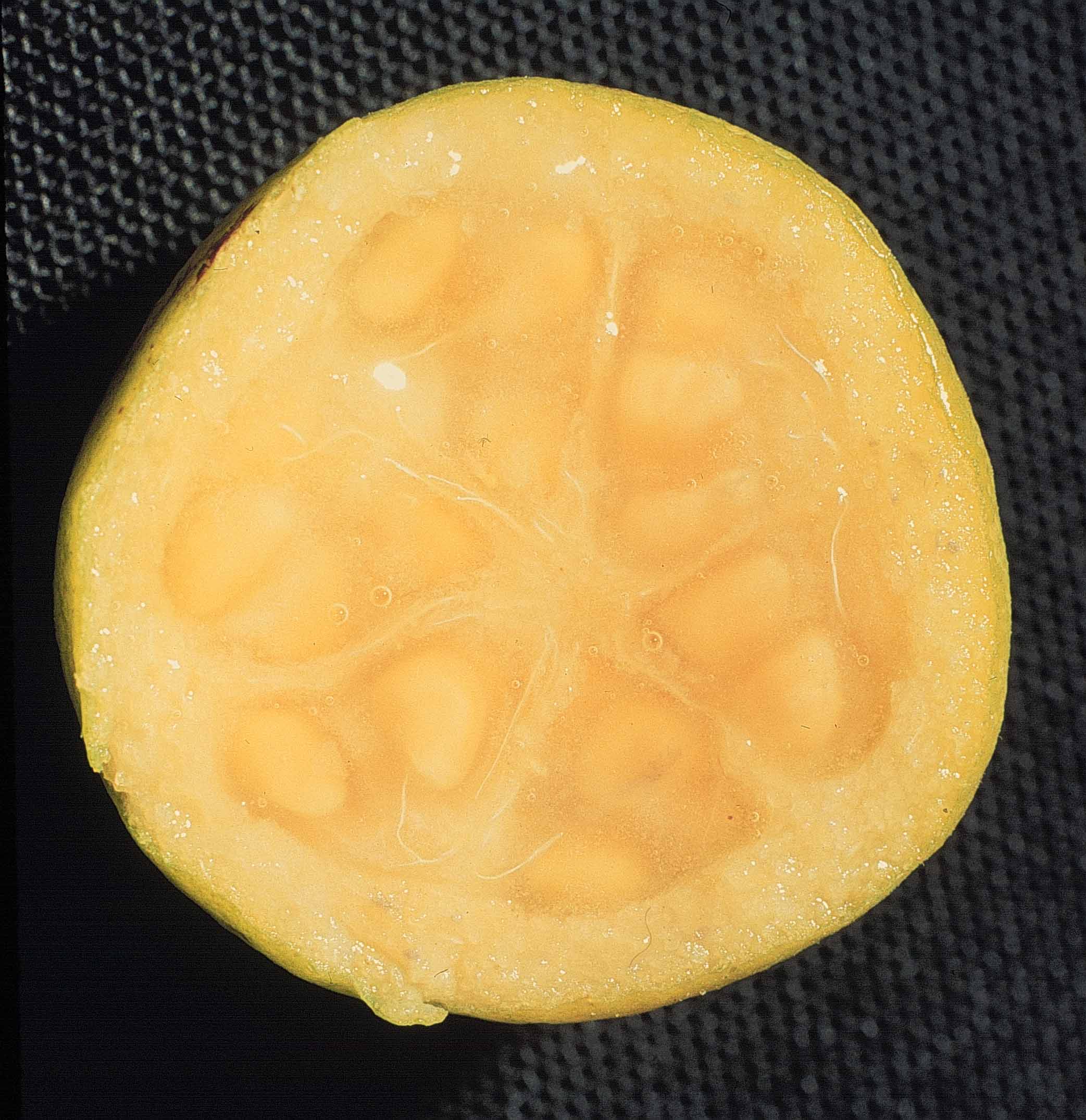 Fruto inmaduro color verde claro, maduro amarillo verdoso, de forma esférica de 1.5 cm delargo, con 2 cm de diámetro. Semillas de aproximadamente 0.3 mm. de largo.