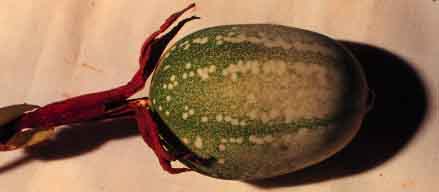 Son bayas ovoides, 5-8 cm de largo, verde-amarillentos con líneas blacas (Croat 1978). El fruto inmaduro es verde claro. Tienen un diámetreo aproximado de 3.5 cm y un largo de 6 cm. Maduran en febrero.