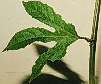 Las hojas son simples y alternas, láminas trilobadas (divididas incompletamente en tres lóbulos) con el lóbulo central más largo, 7-14 cm (Croat 1978). El haz es verde oscuro y el envés verde claro.