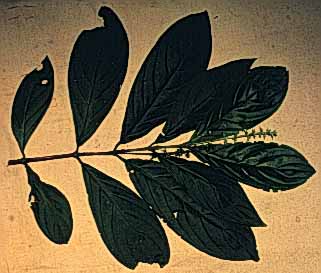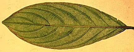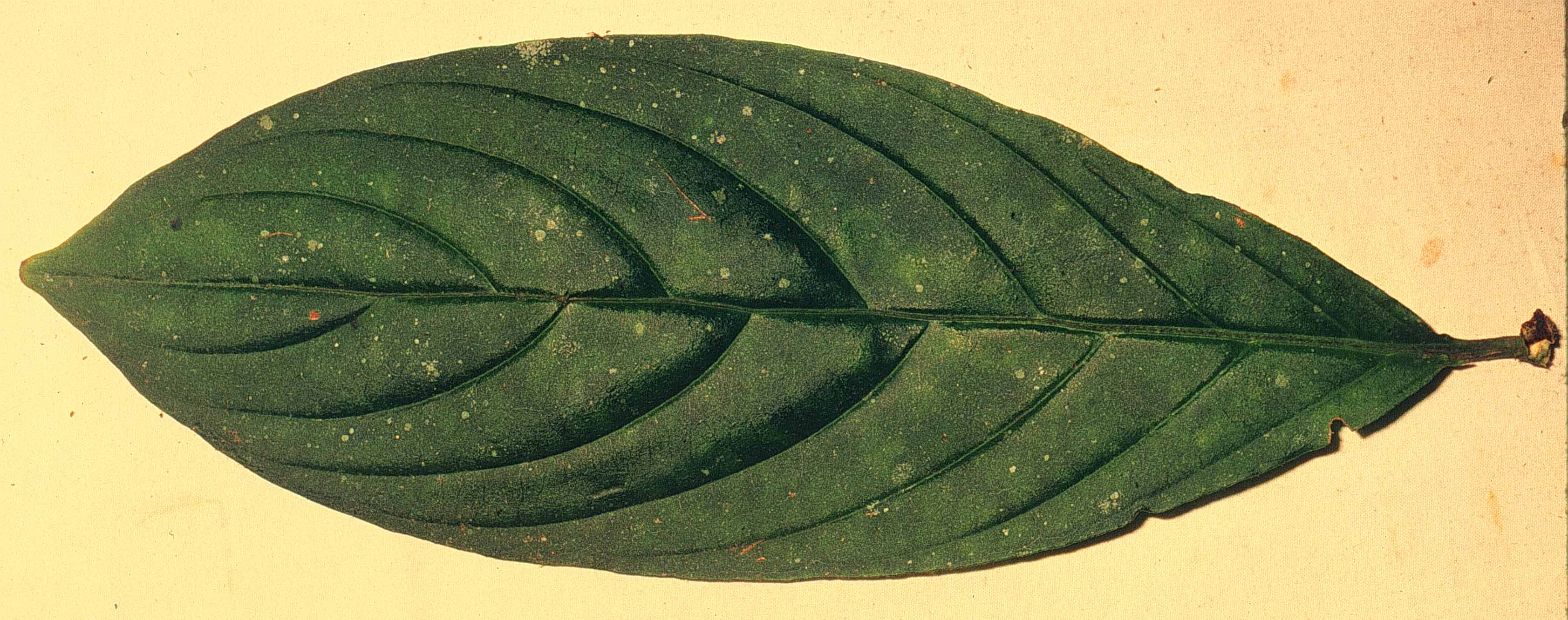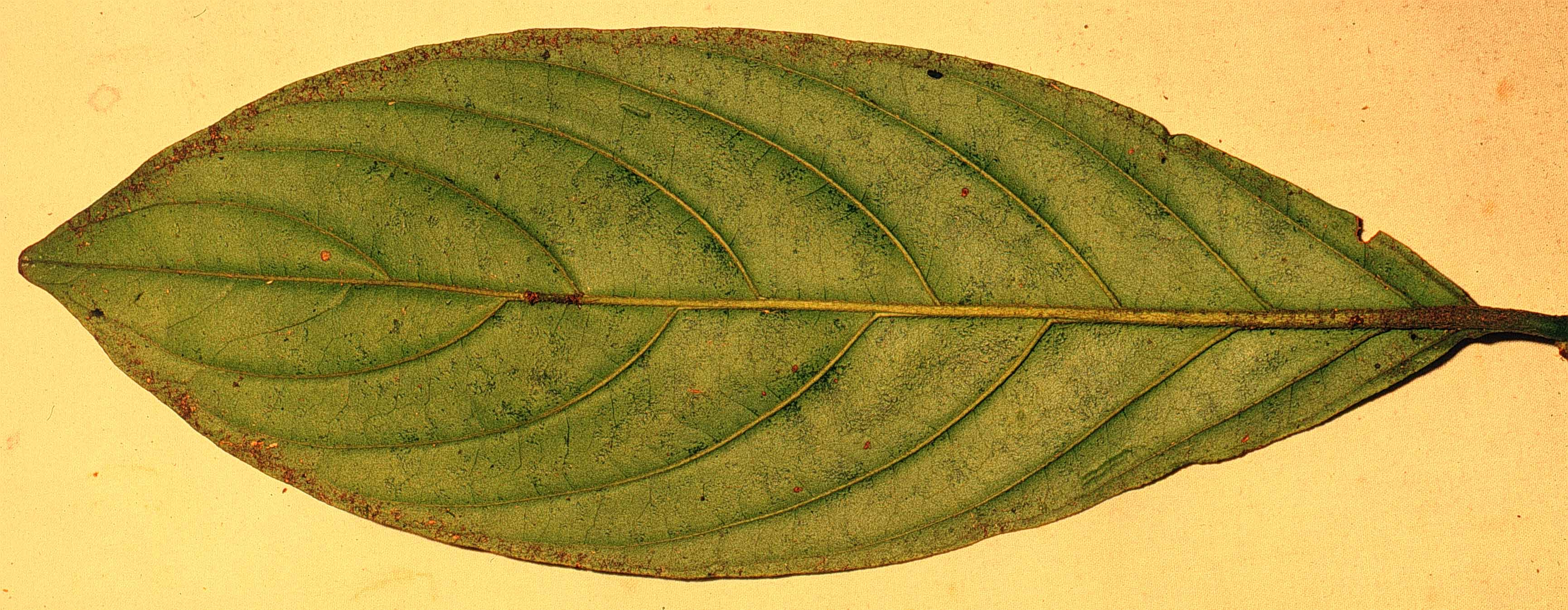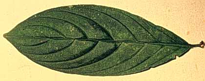 Simples opuestas de 15-25 cm de forma elíptica con margen entero y superficie lisa opaca, con peciolo envainador de 0.8-1.6 cm de largo.