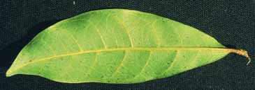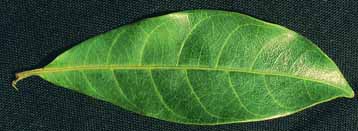 Simples alternas de 7-10 cm de largo, de forma lanceolada con margen entero, peciolo de 1 cm de largo.