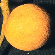 Esférico y carnoso de color anaranjado claro de 4 cm de largo y 5 cm de diámetro, con pubescencia en la superficie, semillas negras.