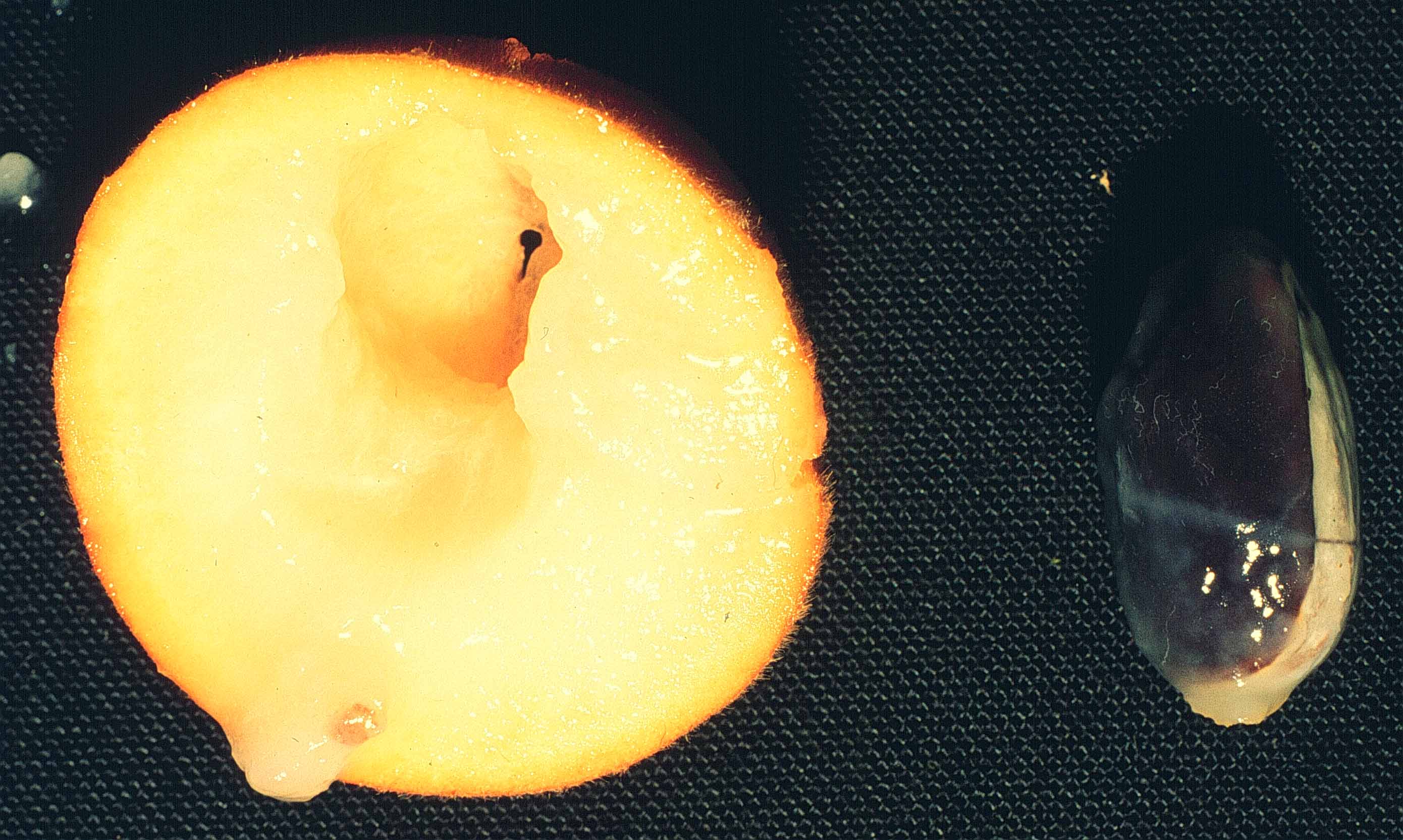 Vista del fruto seccionado y una semilla | |