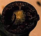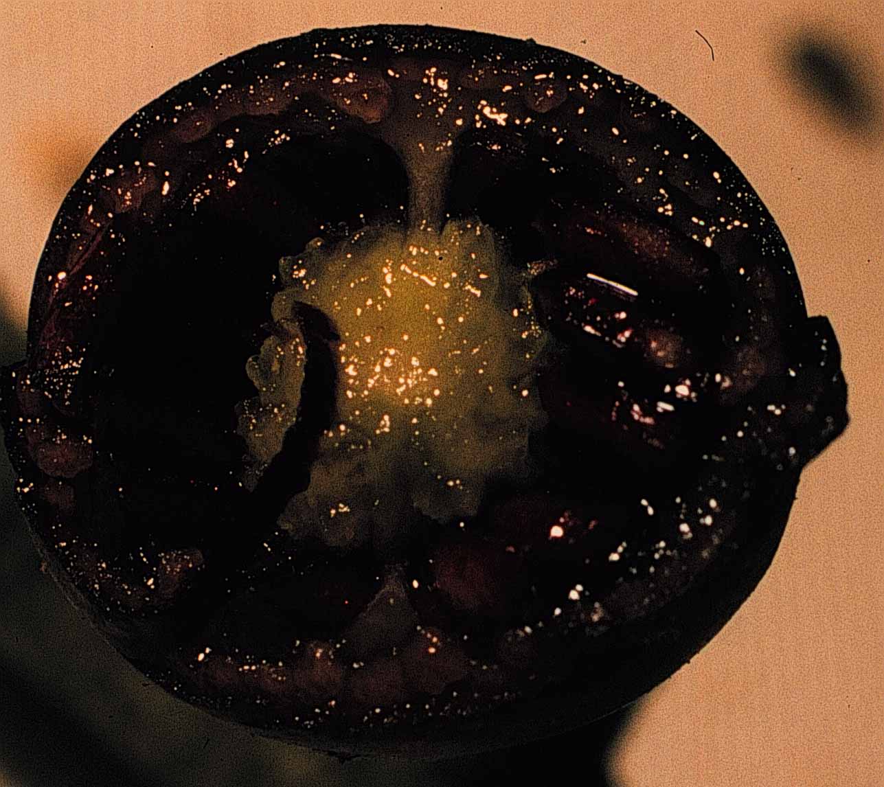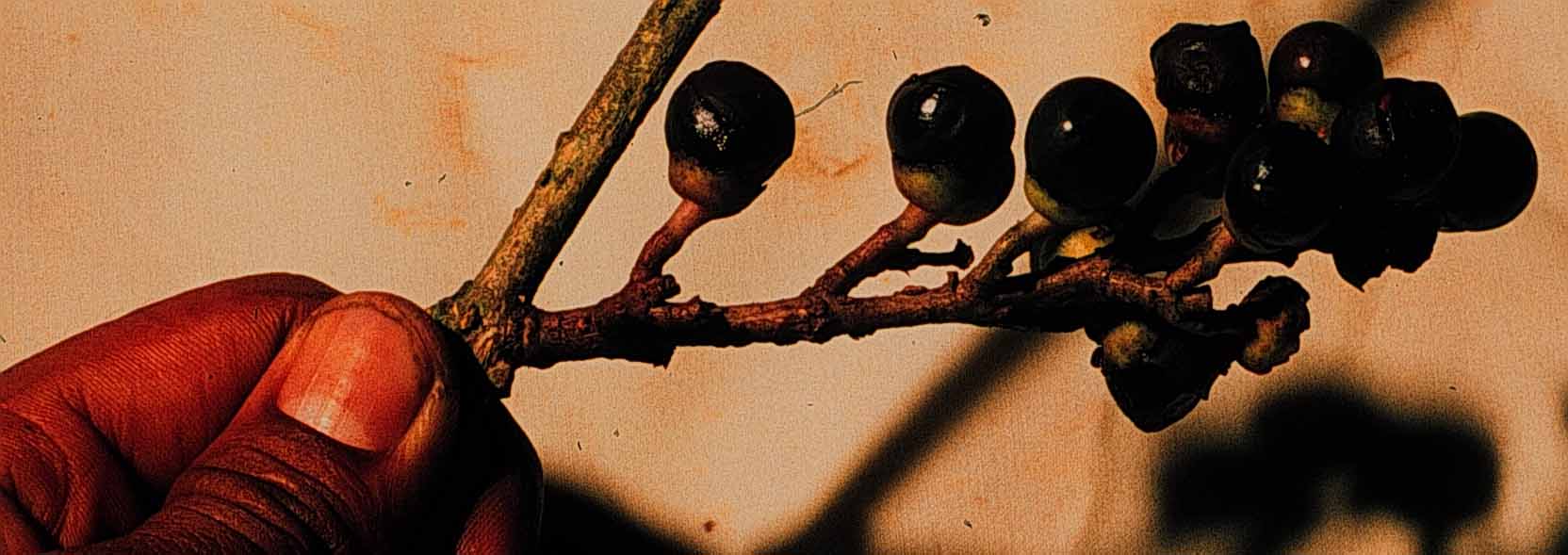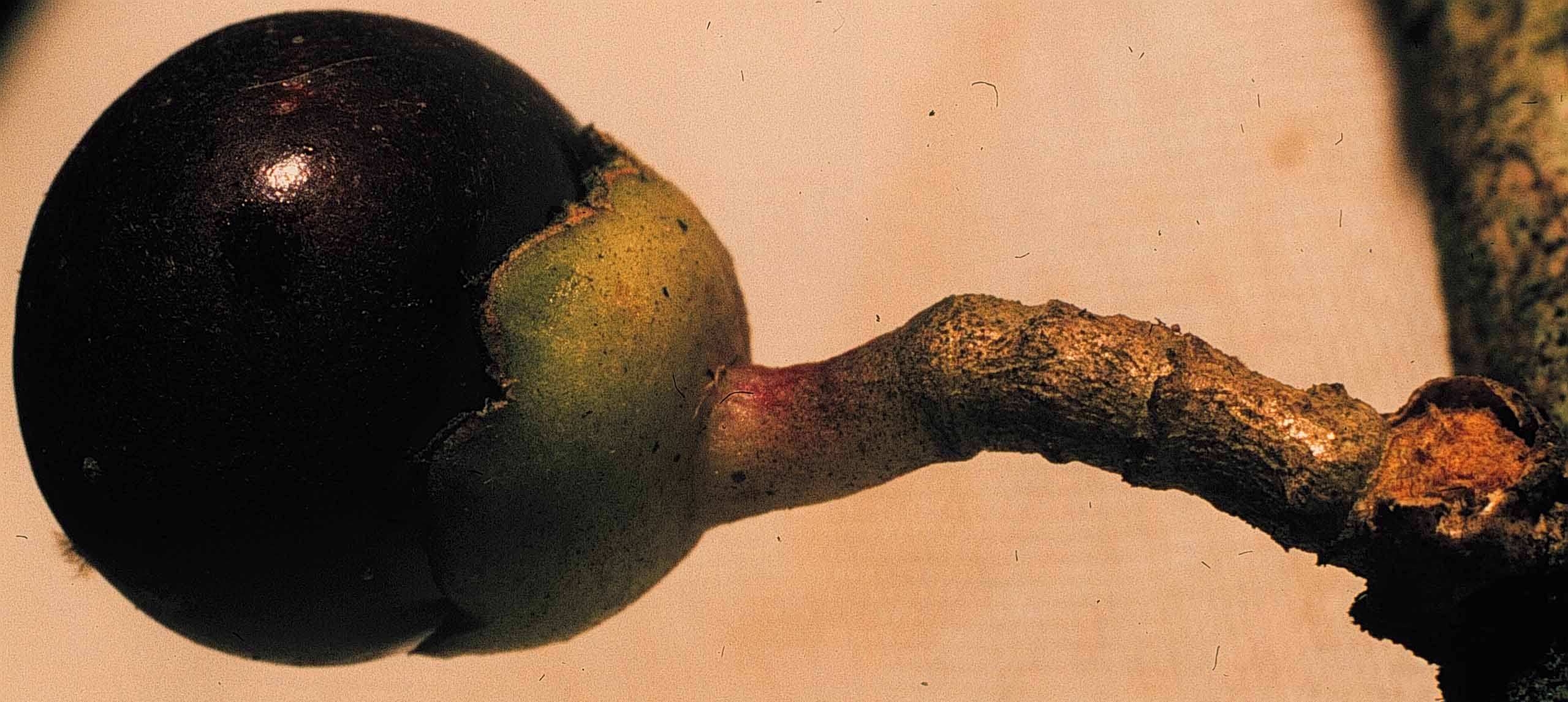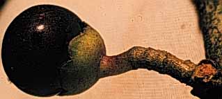 Esféricos de 1.5 cm de largo y 1.5 cm de diámetro aproximadamente, en racimos. De color rojizo en proceso de maduración y maduros de color negros, pulpa blanca.
