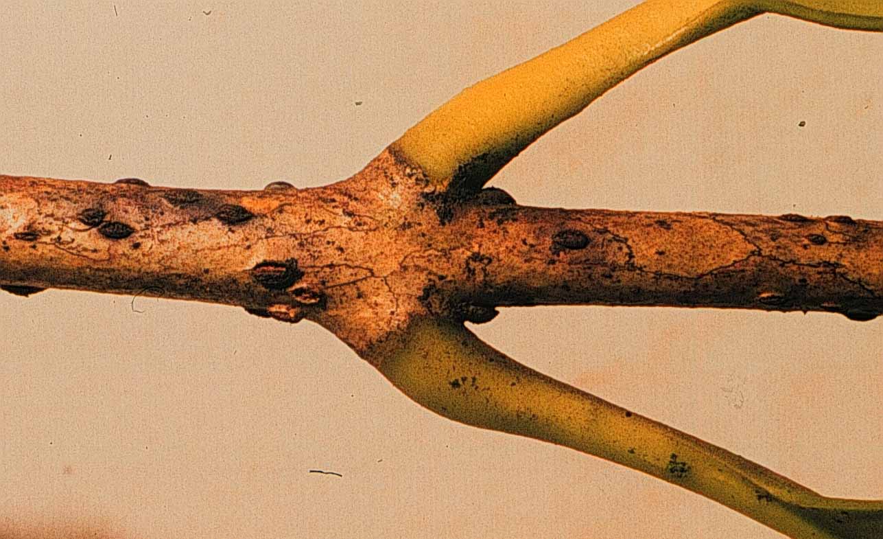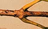 De color gris y forma lisa con liquenes y musgo en todo lo largo del tallo.