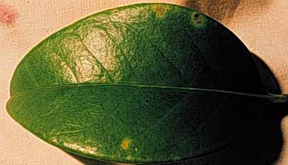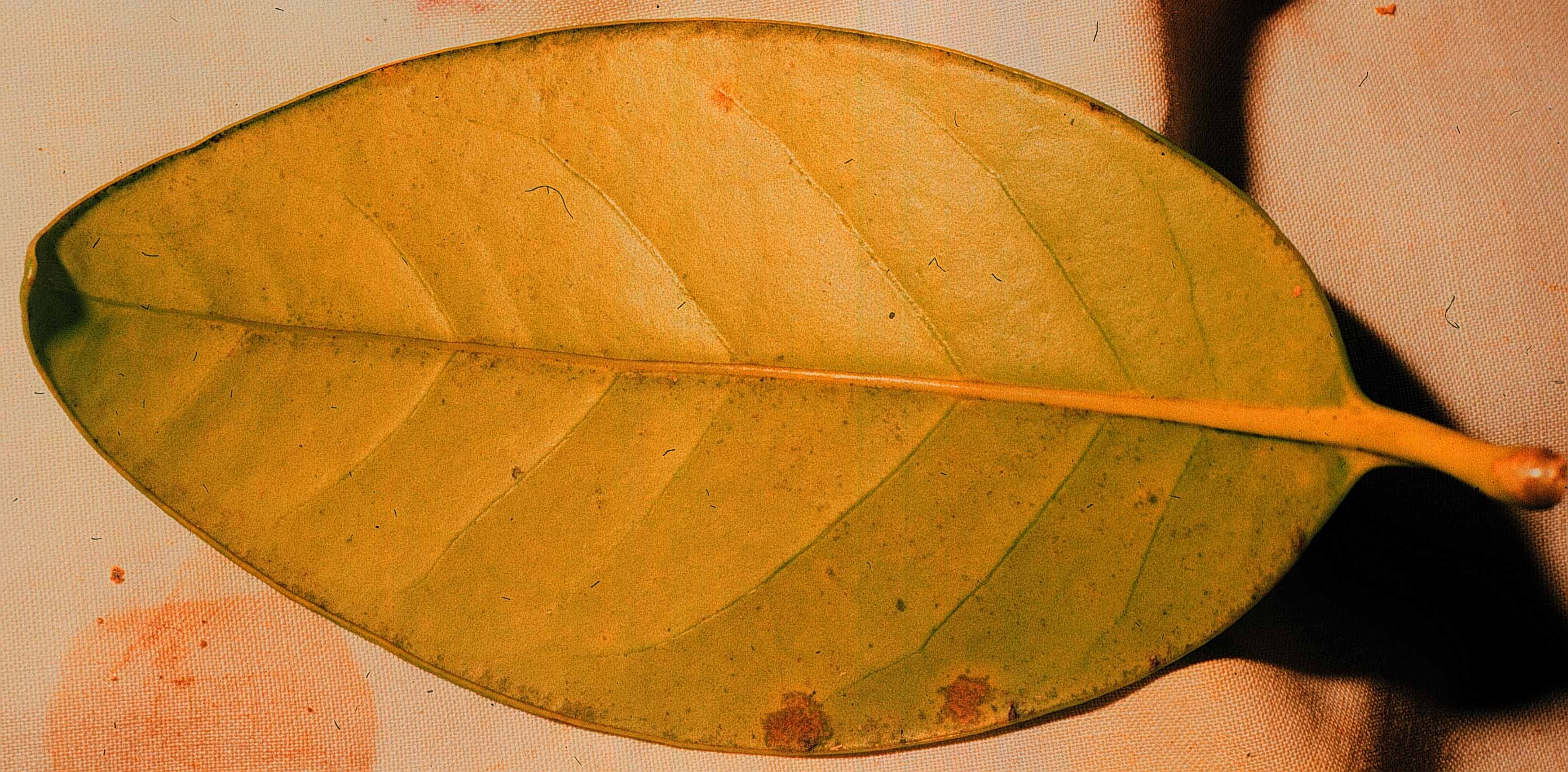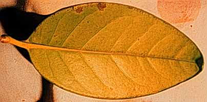 Simples opuestas de 11-13.5 cm de largo de forma lanceolada con margen entero, peciolo cilíndrico de 1.3-2 cm de largo.