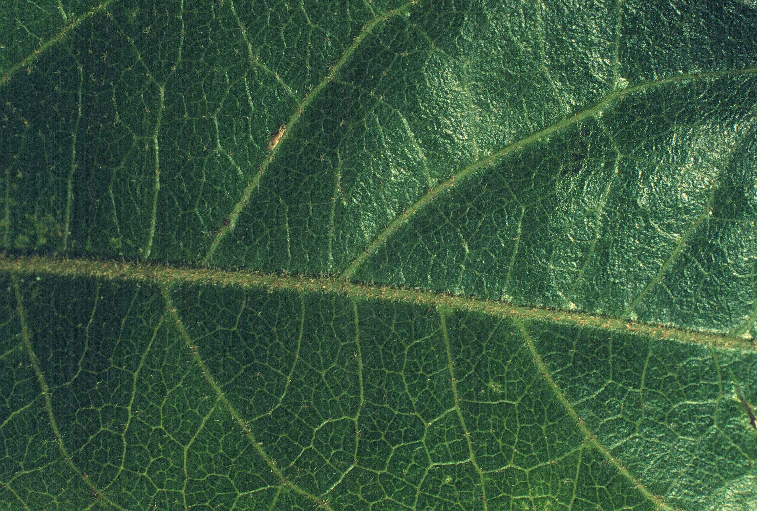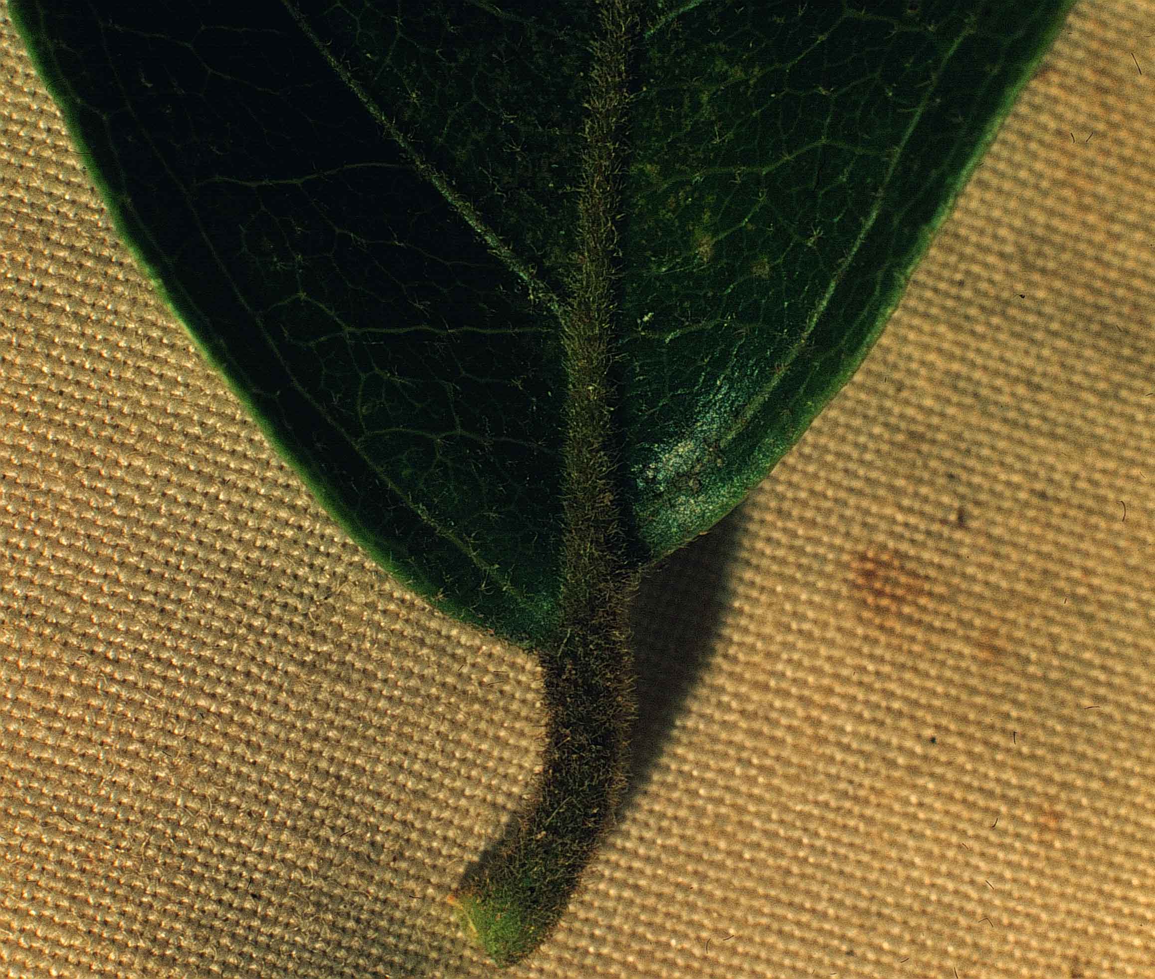 Simples alternas de color verde oscuro. De 7-8 cm largo con un peciolo de 0.5 cm de largo y retorsido; el envéz de las hojas es muy tomentoso.