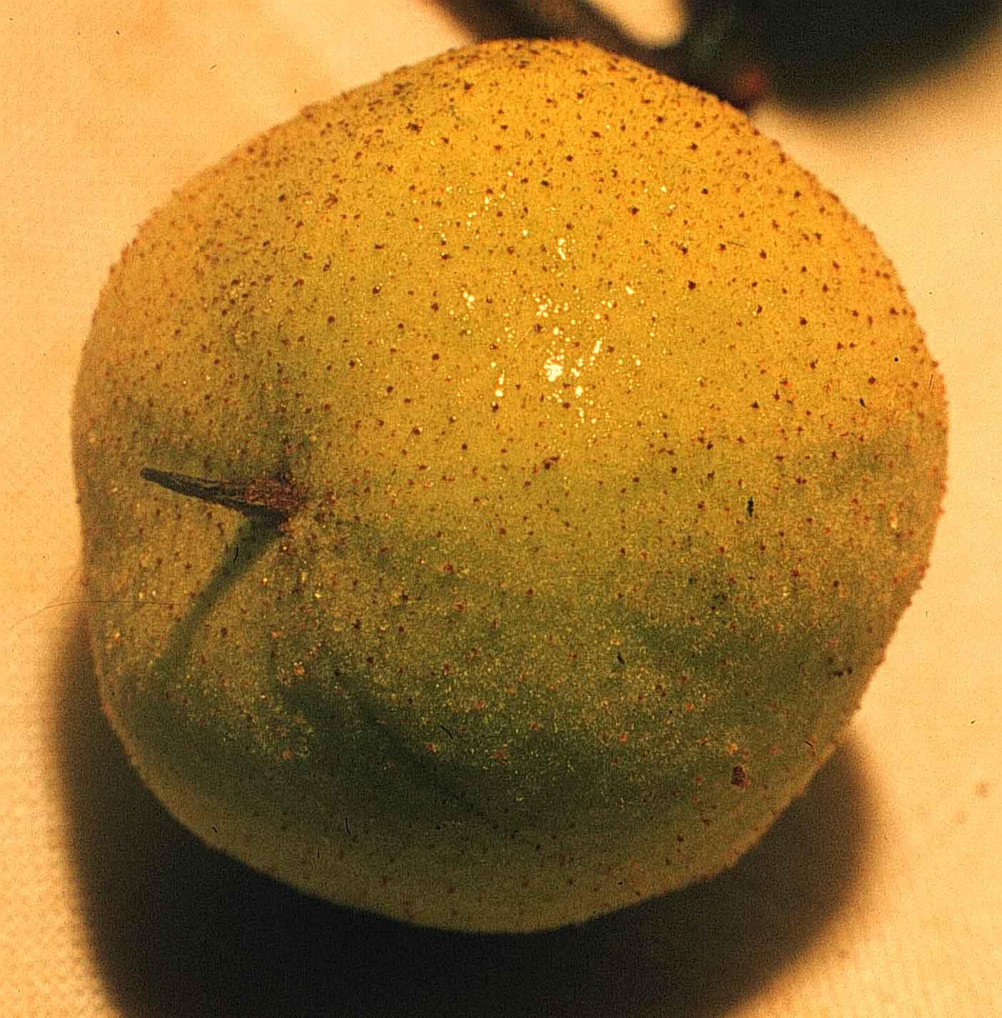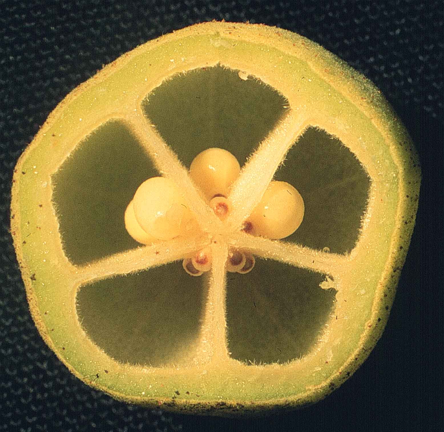 Verde claro, de forma esférica. La superficie es pubescente. Aproximadamente 1.5 cm de largo y 1.5 cm de diámetro. Al hacer un corte transversal se observan 5 cavidades.
