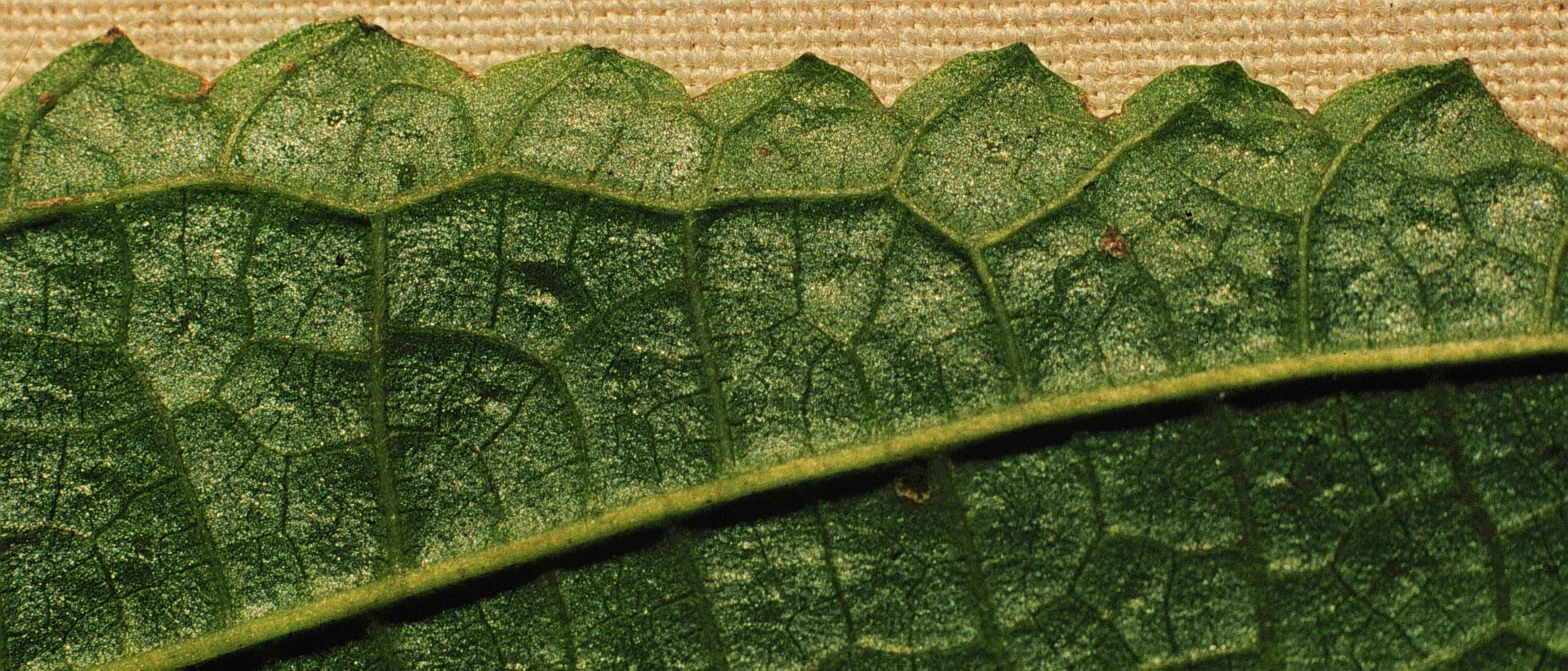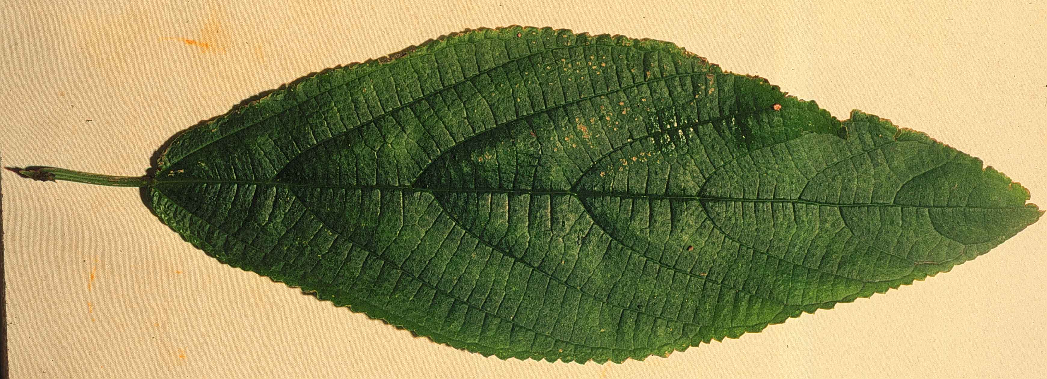 Simples alternas, de 12-21 cm, de forma lanceolada con margen crenado y superficie lisa opaca, peciolo acanalado de 1-2 cm de largo.