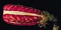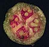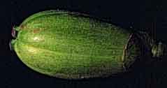 Inmaduro color verde, de forma elíptica, de 2.3 cm de lago, de un diámetro de 1 cm aproximadamente. Semillas de 20-25 por fruto, de 3 mm de largo, estan cubiertas por un arilo de color rojo.
