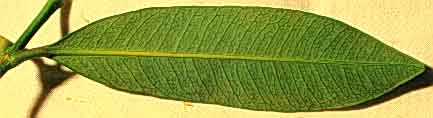 Simples y opuestas de margen entero. Forma lanceolada. Aproximadamente 5-10 cm de largo. Verde oscuro por el haz y verde claro por el envés. El peciolo es aplastado por el haz y mide de 0.8-1 cm.