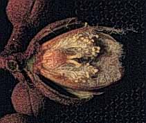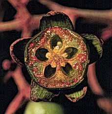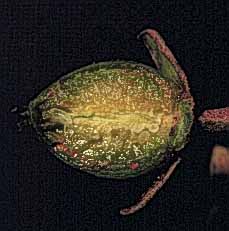 Bayas ovoides, de 0.8-1.5 cm de largo. Secreta látex anaranjado si se le hace un corte.