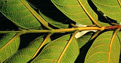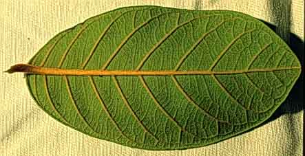 Simples opuestas, oblanceoladas, de 8 cm de largo, margen entero, peciolo acanalado de 0.5 cm largo.