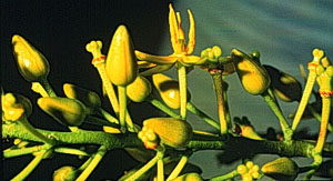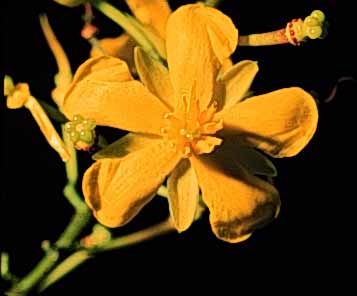 En general las flores son amarillas. Observando más detalladamente los 4-5 pétalos son amarillos y los estambres verde claros. El caliz está compuesto de 5 sépalos. El ovario es tri-lobado.