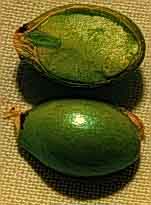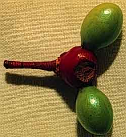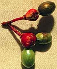 El fruto es muy peculiar ya que el receptáculo (la base del fruto) es engrosado y rojo y cada segmento individual del ovario esta separado en en la superficie del receptáculo en tres bayas negras (Gentry 1984).