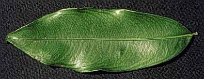 Hojas simples y alternas, de forma lanceolada a oblanceolada y totalmente glabras por ambos lados. Miden de 6-16 cm de largo. Verde oscuro por el haz y verde claro por el envés. Margen aserrado. Peciolo corto (0.5 cm delargo).