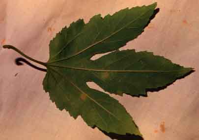 Las hojas son simples y alternas, láminas trilobadas (divididas incompletamente en tres lóbulos) con el lóbulo central más largo, 7-14 cm (Croat 1978). El haz es verde oscuro y el envés verde claro.
