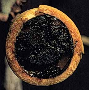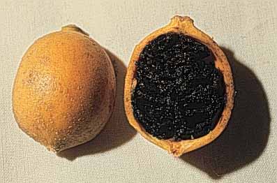 De 3cm de largo y 2cm de ancho, maduro de color café claro, con sabor blanco dulce, sus semillas también son de color café y es factible encontrar entre 30 -36 por fruto, se encuentran rodeadas de un arilo de color negro.