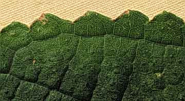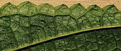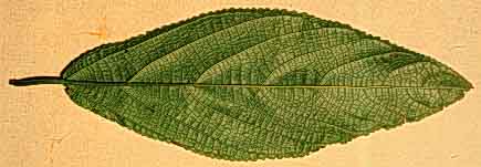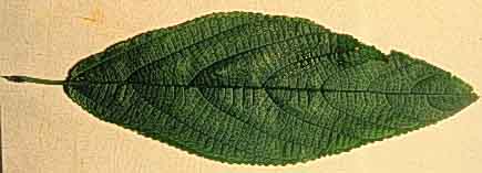 Simples alternas, de 12-21 cm, de forma lanceolada con margen crenado y superficie lisa opaca, peciolo acanalado de 1-2 cm de largo.